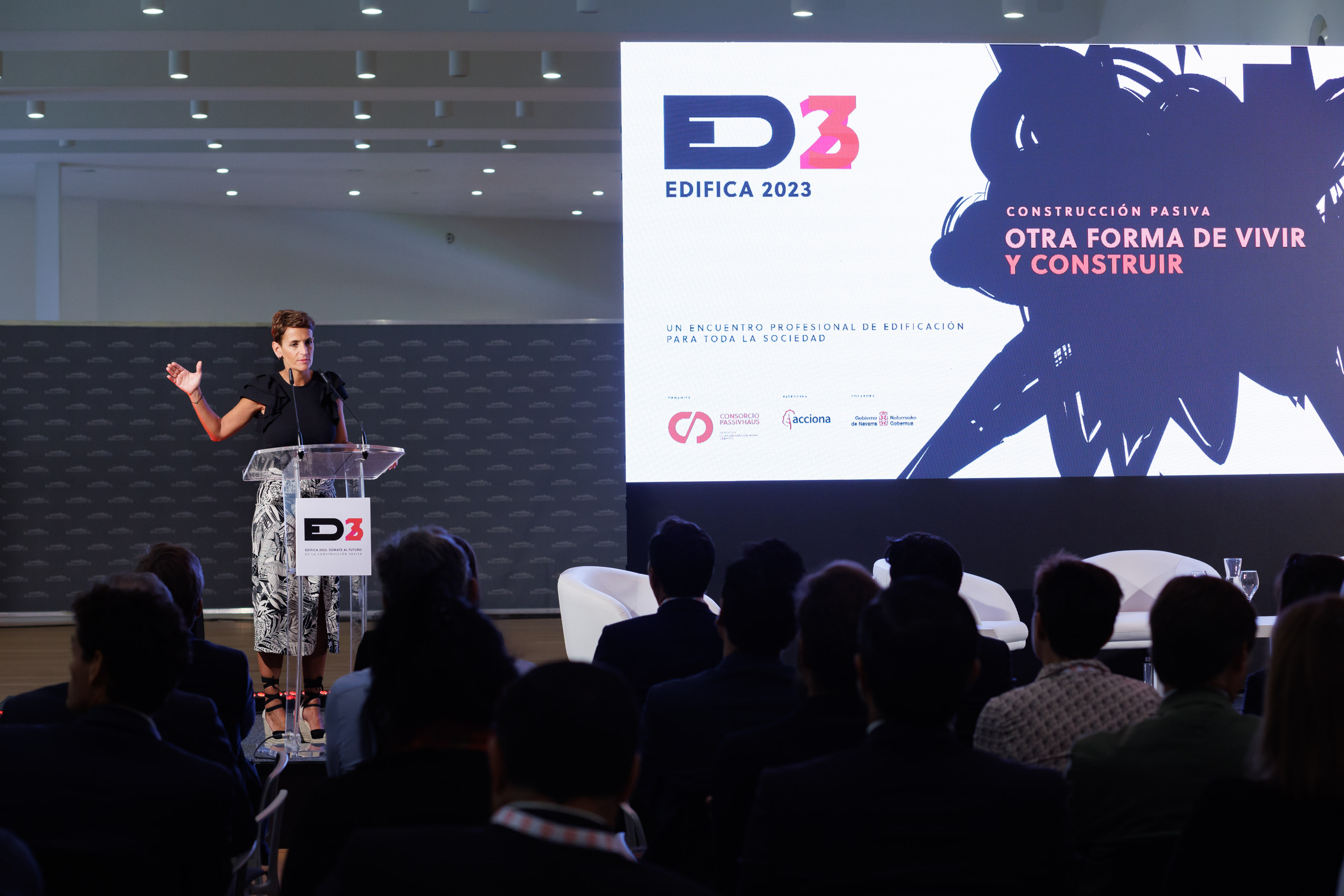 La Presidenta de Navarra, María Chivite Navascués, ha participado hoy en el acto de inauguración de Edifica, una feria que, impulsada por el Consorcio Passivhaus, mostrará entre los días 20 y 22 de septiembre en Baluarte de Pamplona los últimos avances en materia de construcción sostenible.