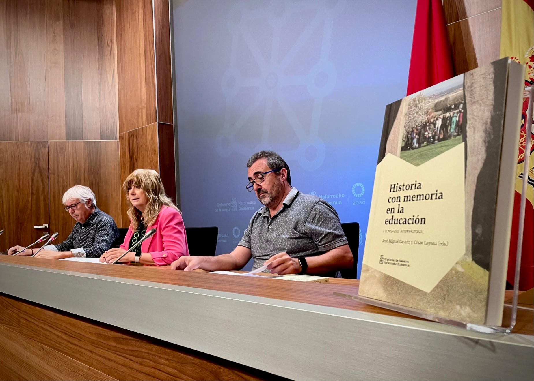 La vicepresidenta segunda y consejera de Memoria y Convivencia, Acción Exterior y Euskera, Ana Ollo, ha presentado en rueda de prensa dos iniciativas del programa educativo del Instituto Navarro de la Memoria: el libro de actas del I Congreso Internacional ‘Historia con memoria en la educación’, celebrado en Pamplona en noviembre de 2022; y la programación para el curso 2023/2024 del programa Escuelas con Memoria, que está dirigido a más de 8.000 alumnas y alumnos. Le han acompañado Josemi Gastón, director del Instituto Navarro de la Memoria, y César Layana, jefe de la sección de Documentación del instituto, que han coordinado la edición de las actas.