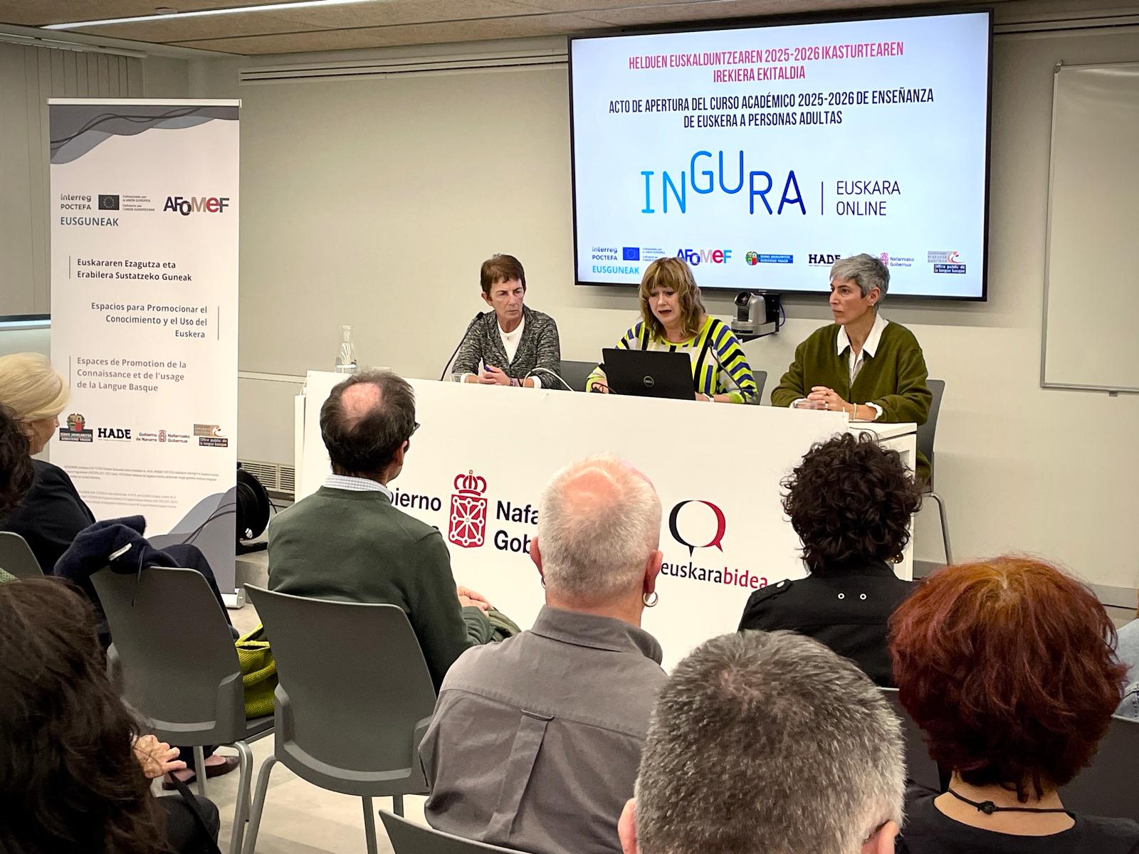 La vicepresidenta del Gobierno de Navarra y consejera de Memoria y Convivencia, Acción Exterior y Euskera, Ana Ollo, ha destacado el aumento de matriculaciones de personas adultas para aprender euskera en los últimos años en la sociedad navarra, durante el acto de apertura del curso académico 2025-2026 de euskaldunización de personas adultas de Navarra, que se ha celebrado este mediodía en Pamplona /Iruña. La vicepresidenta ha estado acompañada por Javier Arakama, director gerente de Euskarabidea-Instituto Navarro del Euskera, y Eskarne Lopetegi Zalakain, licenciada en filología vasca, jefa del área de Metodología y Contenidos de HABE (Instituto de Alfabetización y Reeuskaldunización de Adultos) y responsable de la plataforma de aprendizaje de euskera on line INGURA. Lopetegui ha impartido una conferencia para presentar la plataforma INGURA y explicar sus objetivos para este curso.