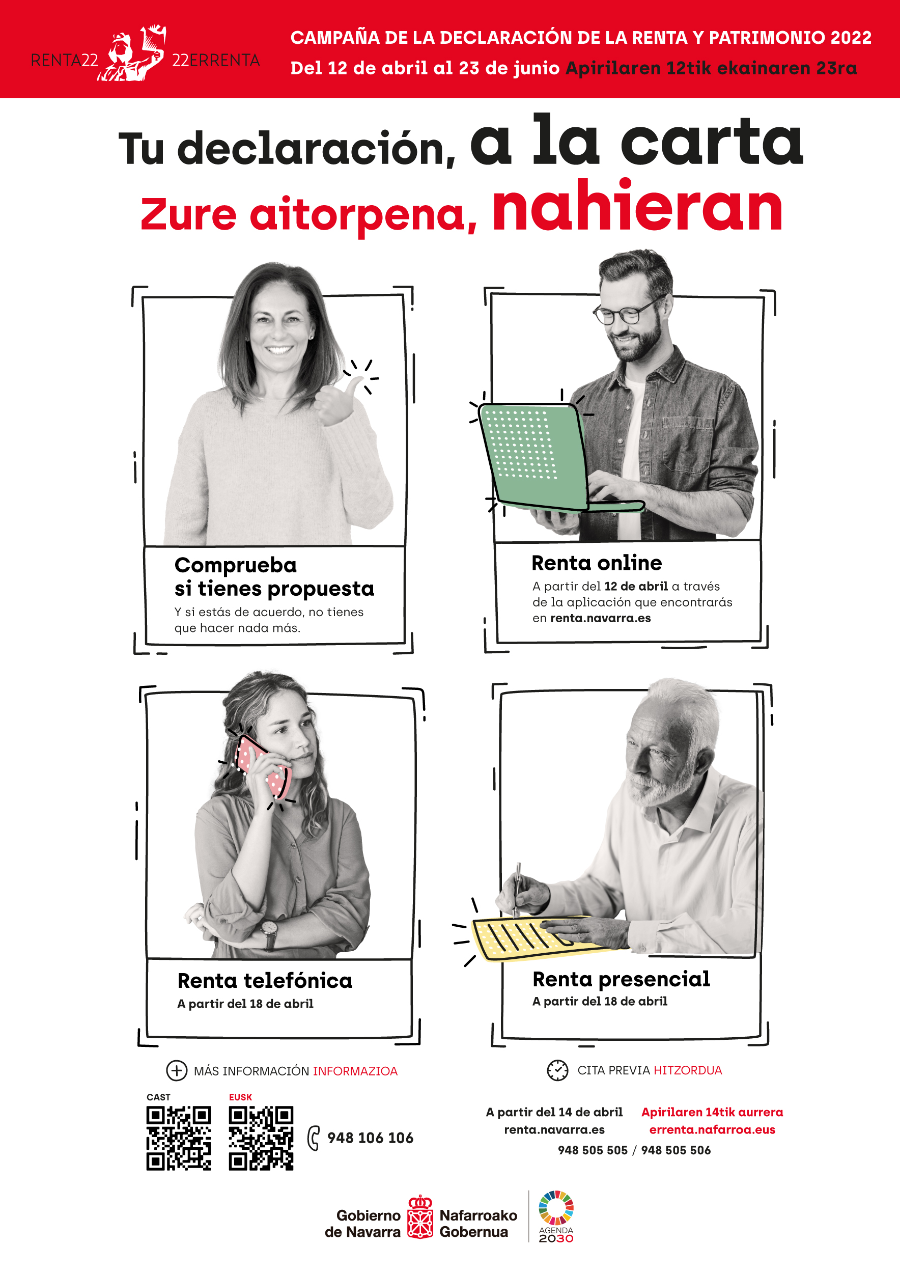 Además, desde el día 18 comenzará el periodo para presentar las declaraciones a través de la Renta Telefónica, que este año se mantiene. En este caso, se desarrollará entre los días 18 de abril y 23 de junio y para ella será necesaria la solicitud de cita previa, a partir del 14 de abril, a través de Internet (renta.navarra.es)