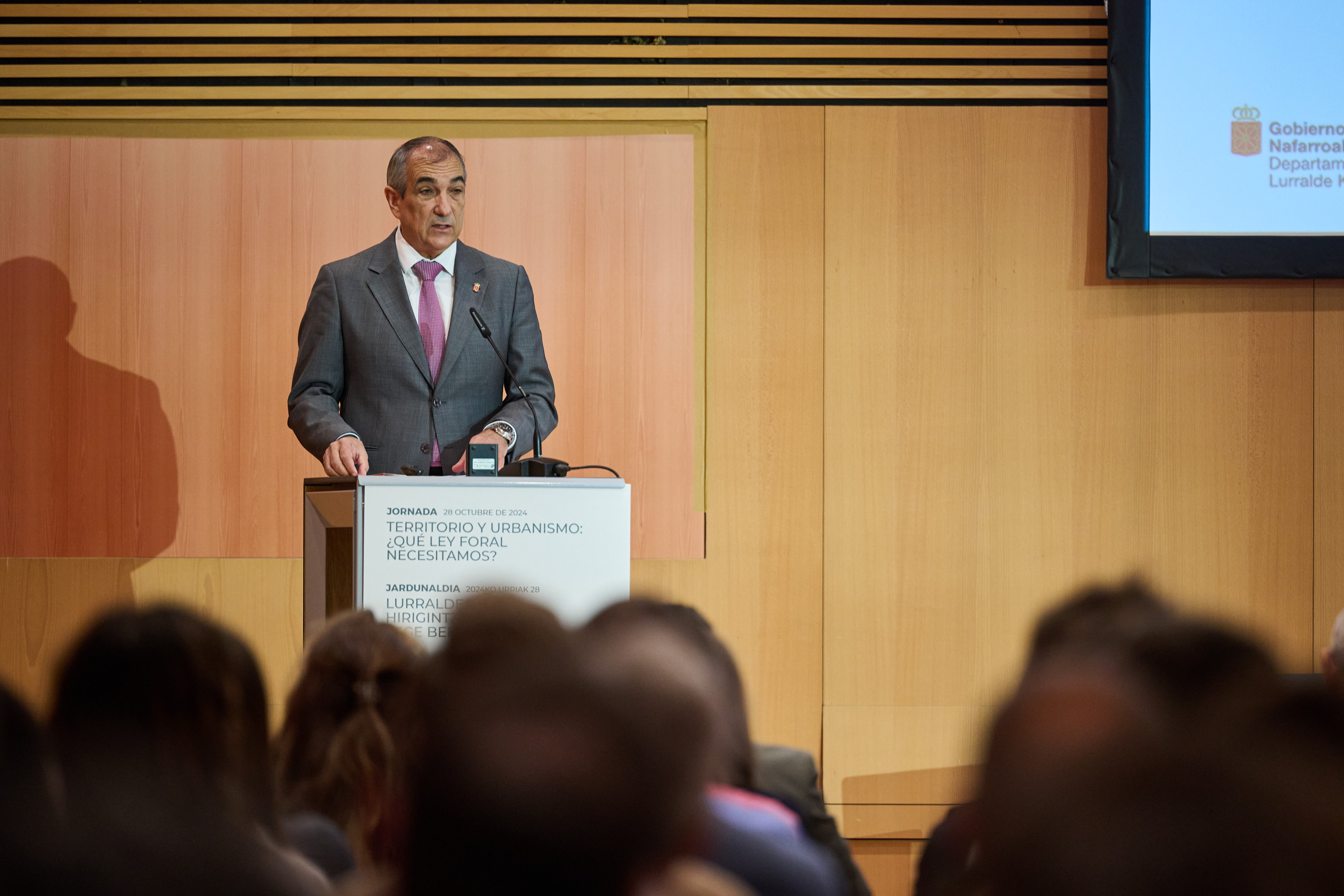 Durante la apertura de las jornadas ‘Territorio y Urbanismo: ¿Qué Ley Foral Necesitamos?’ en la que han participado más de 200 personas, el titular de Cohesión Territorial ha presentado las líneas maestras de lo que será la futura Ley Foral de Ordenación del Territorio y Urbanismo que se asentará en la mirada hacia el mundo rural, el reto de simplificar los procesos administrativos y apostar por la sostenibilidad.
