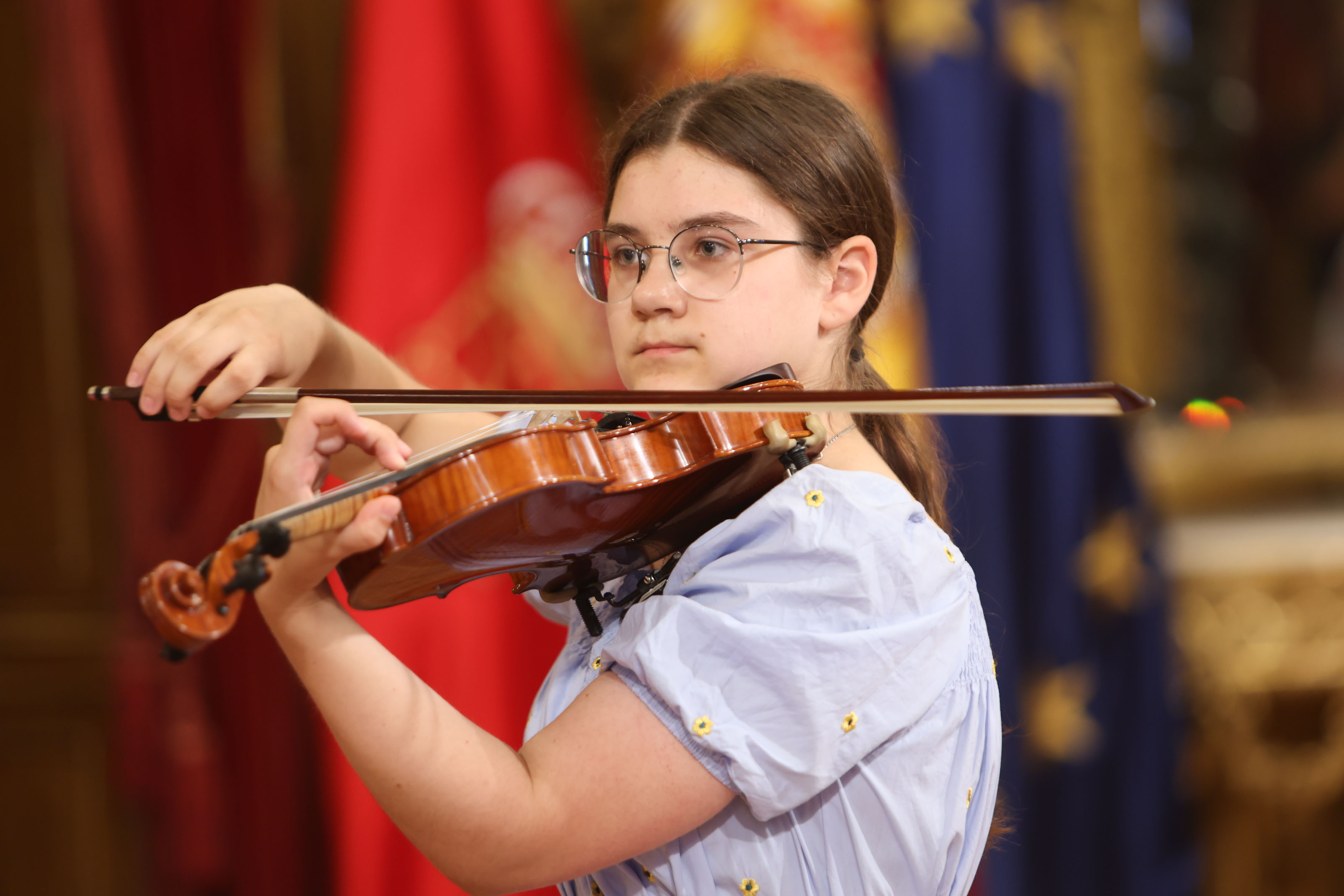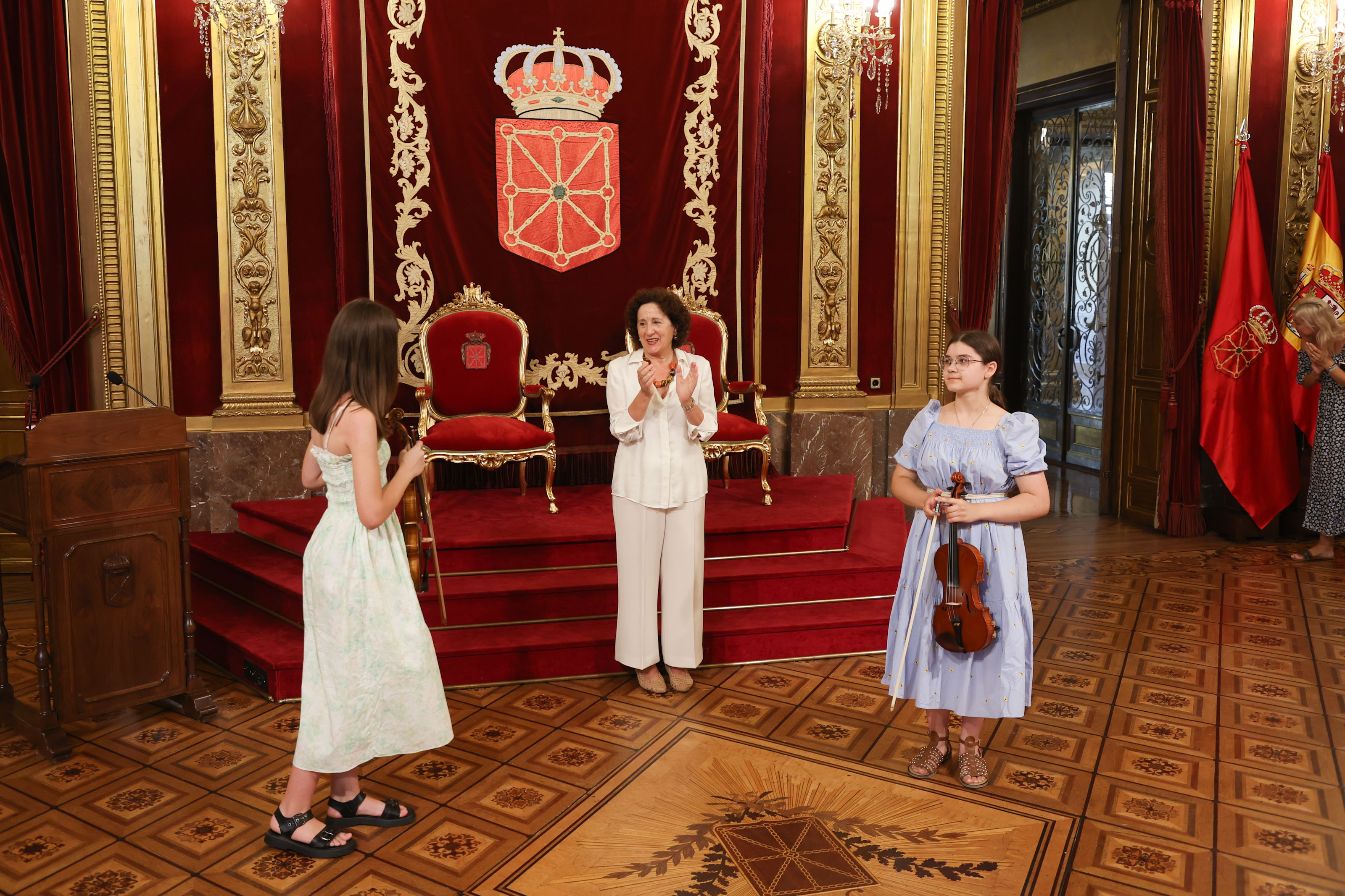 Entretanto, han dado una pequeña muestra de talento interpretativo, atreviéndose con la pieza "Navarra", de Pablo Sarasate, una suerte de jota para dos violines que ha refrescado el Salón del Trono de la sede del Ejecutivo.