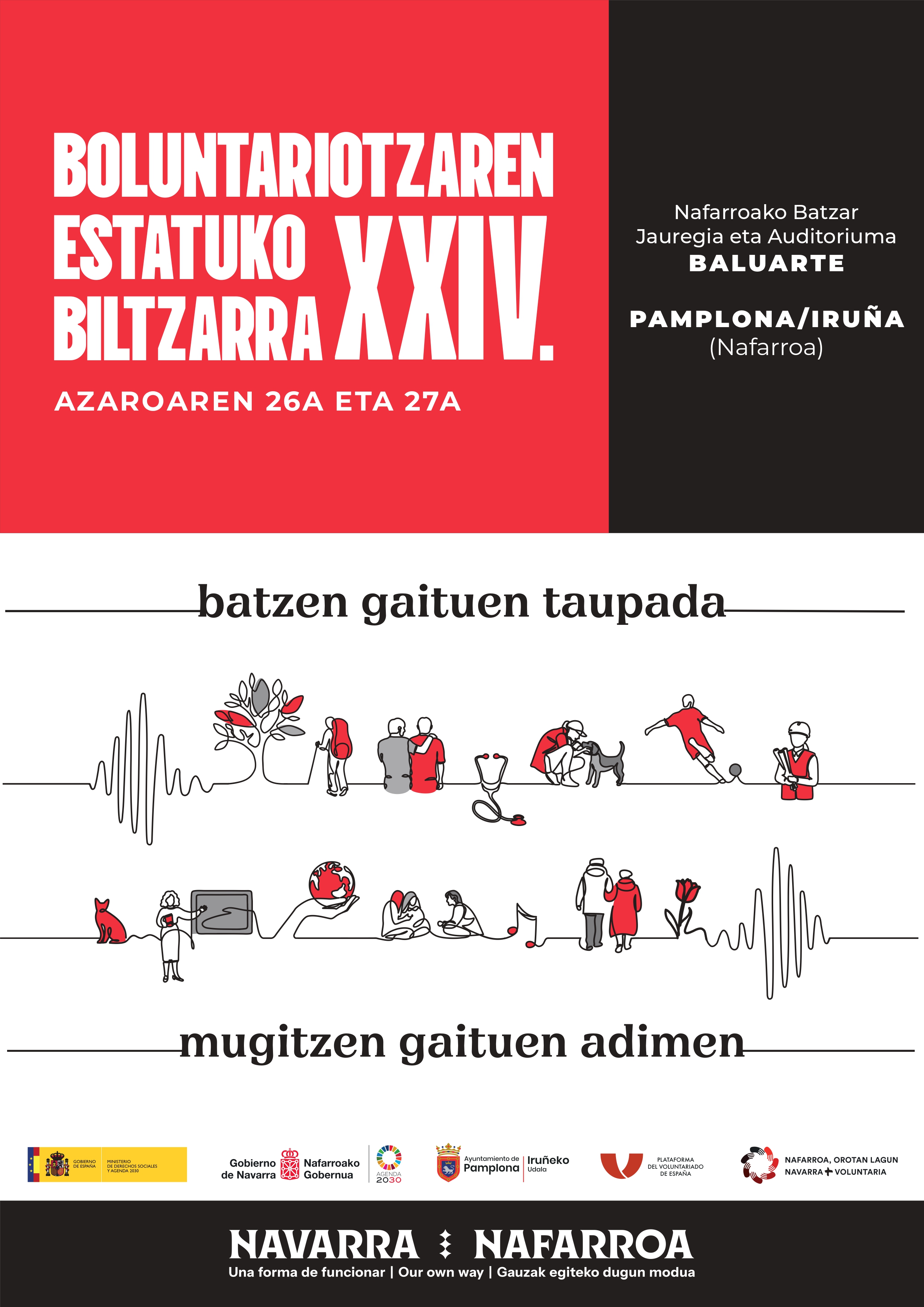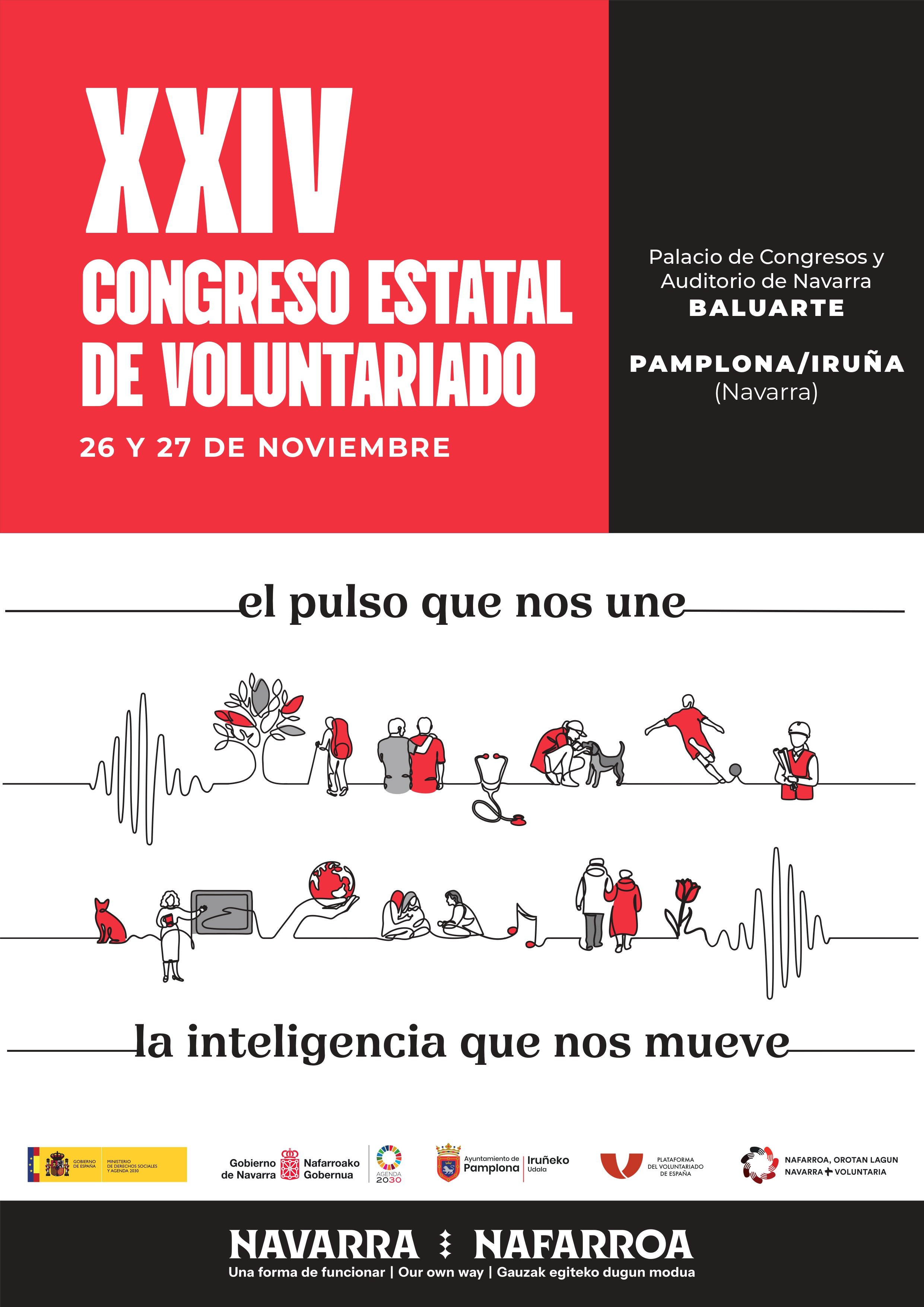 La cita se celebrará en el Palacio de Congresos y Auditorio de Navarra-Baluarte, bajo el lema ´El pulso que nos une, la inteligencia que nos mueve´, que nace de la fusión de dos ideas: la de la energía invisible pero poderosa que conecta a quienes deciden dar su tiempo, su escucha y su dedicación, que es el corazón del voluntariado; y la de inteligencia que nos recuerda que el voluntariado no es solo acción, sino también reflexión, creatividad y visión.