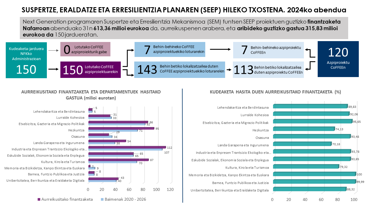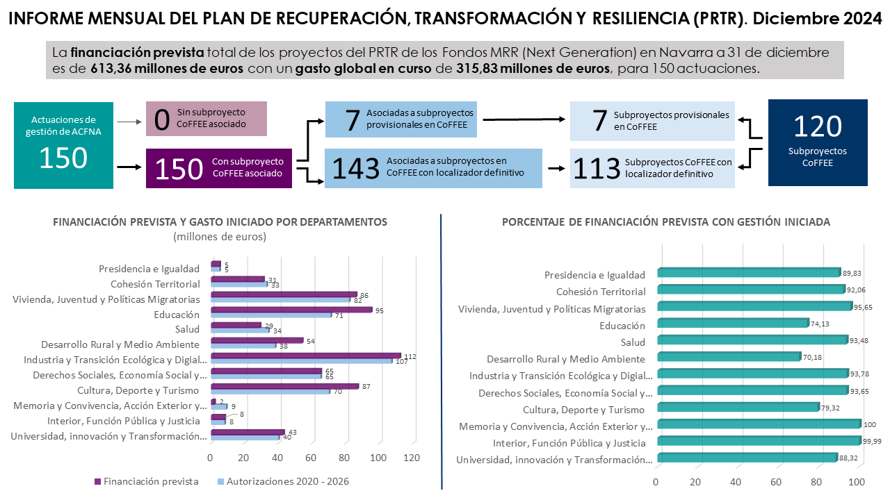Al cierre de 2024, la Comunidad Foral había recibido 613,36 millones de euros de los 616,82 millones, provenientes de la financiación de fondos MRR, asignados a actuaciones derivadas del Plan de Recuperación, Transformación y Resiliencia (PRTR).