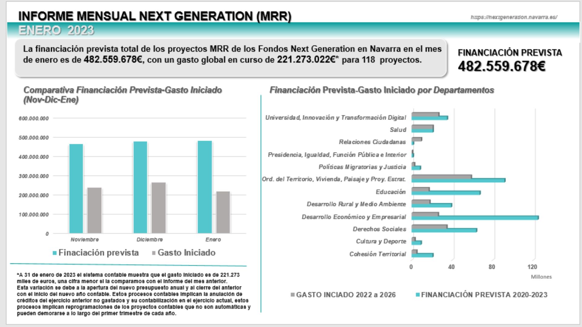 Navarra ha finalizado el mes de enero con una financiación prevista total de los proyectos MRR (Mecanismo de Recuperación y Resiliencia) de los Fondos Next Generation en Navarra, que asciende a 482.559.678 euros para los 118 proyectos contemplados en ese momento.