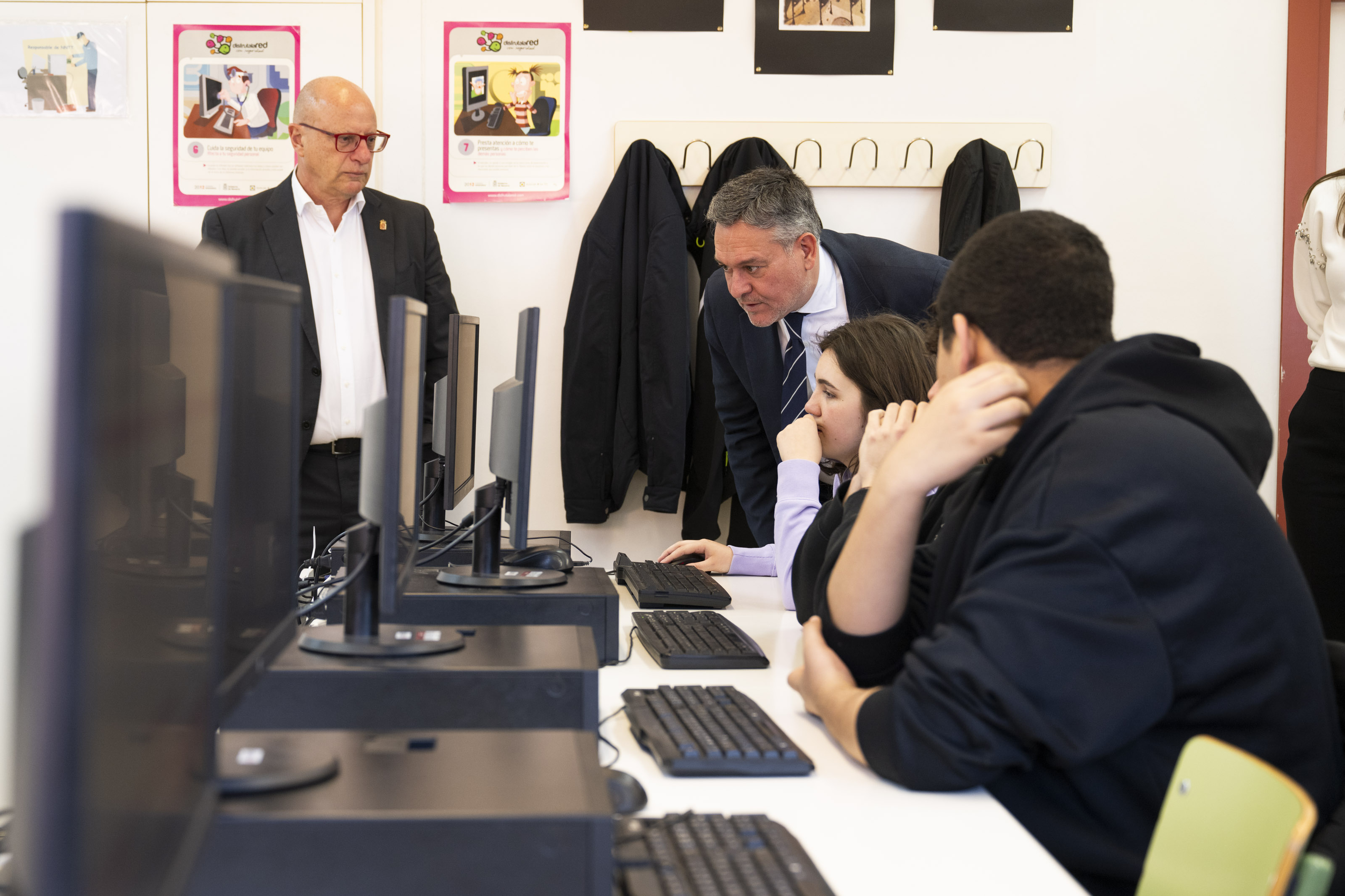 El consejero de Educación, Carlos Gimeno; y el consejero de Universidad, Innovación y Transformación Digital, Juan Luis García; han asistido a la última de las pruebas piloto de certificación en competencias digitales, que se han llevado a cabo en el Instituto de Educación Secundaria Valle del Ebro de Tudela. El test ha contado con la participación de 47 alumnos y alumnas de 4º de la ESO y 2º de Bachillerato. (Aquí se ofrece un ejemplo de preguntas)
