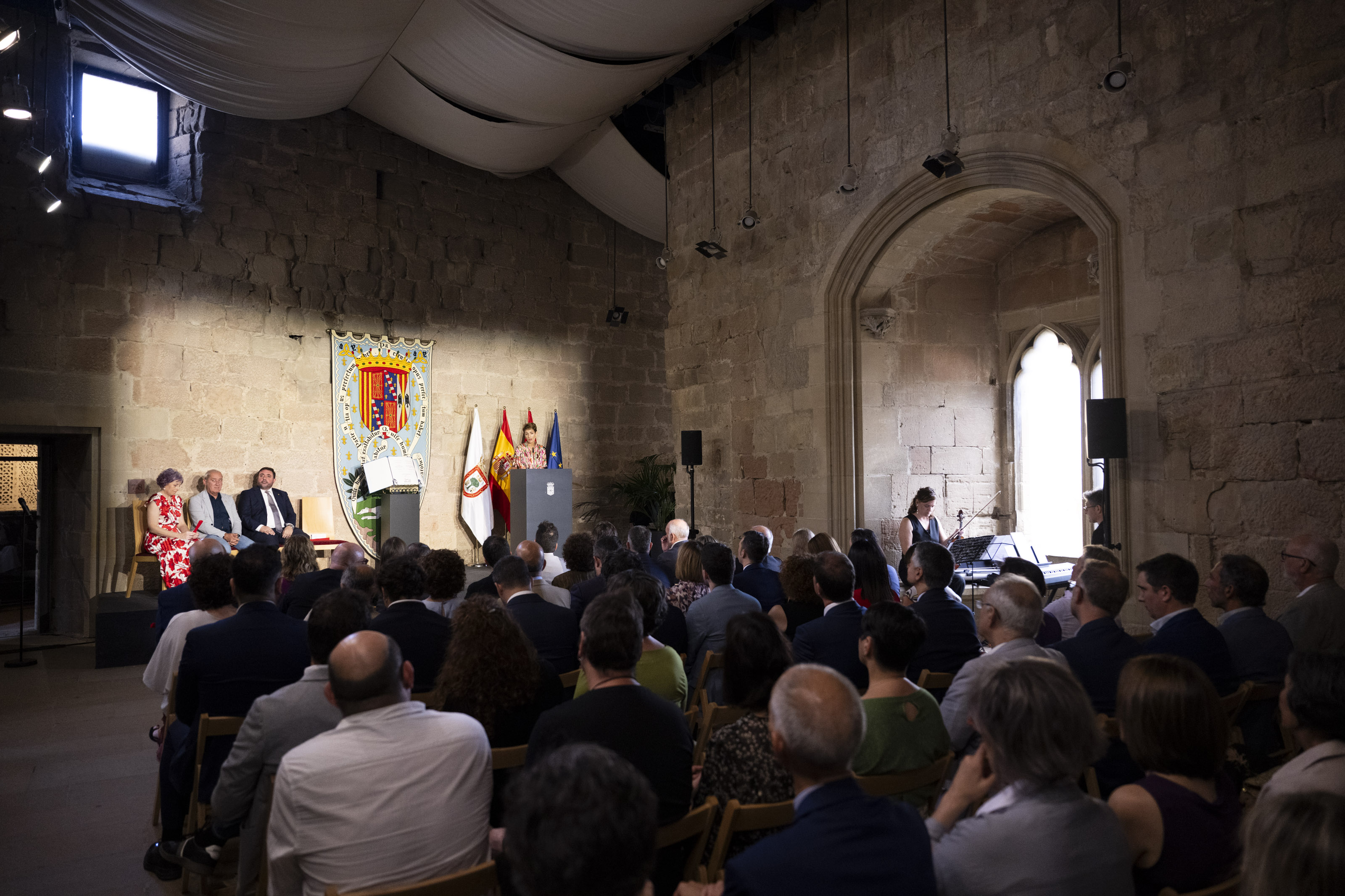 El acto ha estado presidido por el pendón del Principado de Viana, y ha contado con las intervenciones musicales del Esemble Sinfonía Navarra, compuesto por Leire Fernández Saiz de Murieta (violín) y Francesco Casali (piano), quienes han interpretado, ‘O son do arl’, ‘Haite cherie’, ‘Siyahamba’ y ‘Horpipe’, además del Himno de Navarra al inicio el acto.