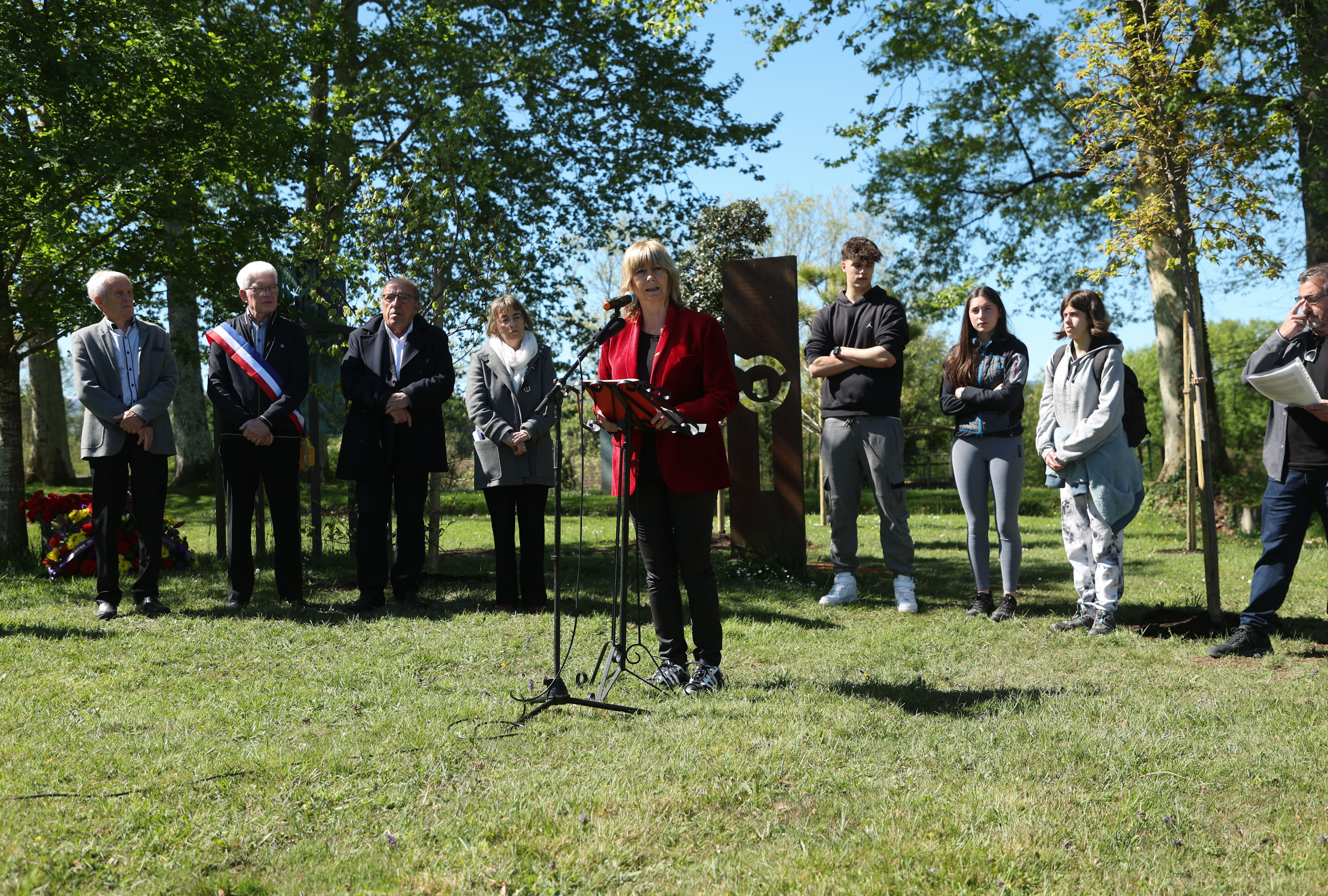 La vicepresidenta segunda y consejera de Memoria y Convivencia, Acción Exterior y Euskera, Ana Ollo, ha cerrado el acto justificándolo en la necesidad de “reforzar su homenaje y mensaje de forma simbólica inaugurando este pequeño monumento junto a la placa de sus nombres. Y hacerlo en compañía de entidades como la asociación Tierras de Memorias y de Luchas que a este lado de la frontera llevan tiempo manteniendo viva la llama de la Memoria Democrática, de la lucha por la verdad y la reparación”. Ana Ollo también se ha dirigido al alumnado venido de Estella porque “sois el futuro de una sociedad que debe aprender de lo sucedido –ha dicho- para que nada de lo que se vivió aquí vuelva a suceder. Ni aquí ni en ningún lugar. Nunca más para nadie. Y es que por desgracia imágenes de campos de refugiados o de prisioneros que parecían ya olvidadas o que nos vienen a la cabeza en blanco y negro están volviendo en color a nuestros telediarios, los periódicos o las redes sociales. La guerra y la violencia no están tan lejos. Europa vive momentos delicados.  Pero hay que mantener viva la llama de la esperanza. Recordar que en este mismo lugar seguramente hubo muchas historias de compromiso, de solidaridad, de ayuda, de empatía” ha señalado.