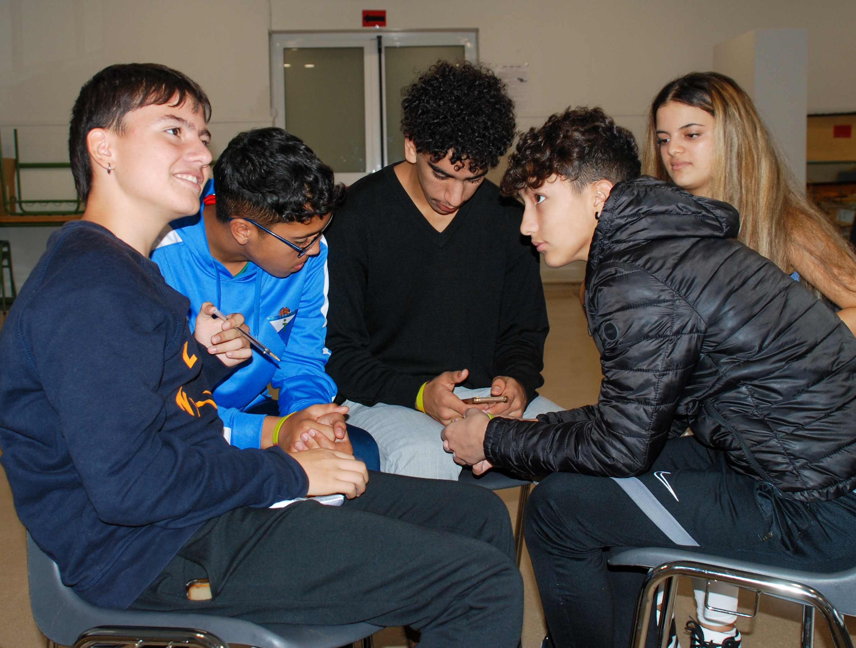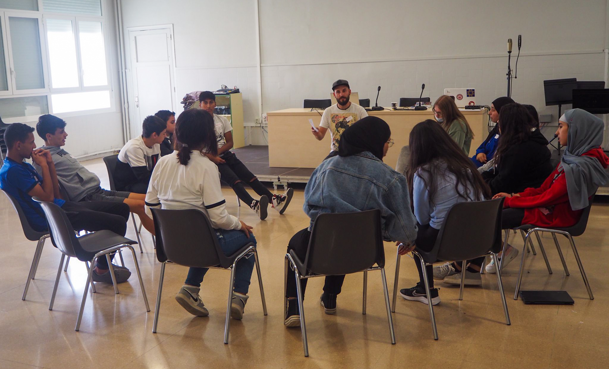 Pero la música no es lo único que crea lazos entre Txus y los adolescentes. Conoce sus códigos de comunicación, sus ritmos, su mundo interior, y eso enseguida se proyecta en la dinámica del taller. Con el silencio sepulcral creado con su frase explosiva al inicio consigue que se genere un clima de escucha y sus siguientes intervenciones tratan de apelarlos de manera directa para obtener una respuesta y engancharlos poco a poco. “¿Quiénes de aquí sois migrantes?”, les interpela. Esa pregunta crea una especie de calma tensa en el aula. Hay quienes levantan la mano y la bajan, quienes miran a los lados, quienes preguntan qué es ser migrante. “A partir de ese momento, cada uno empieza de forma natural a exponer sus dudas, inquietudes y vivencias individuales que acaban enriqueciendo la visión de todos”, apunta Txus con brillo en los ojos.