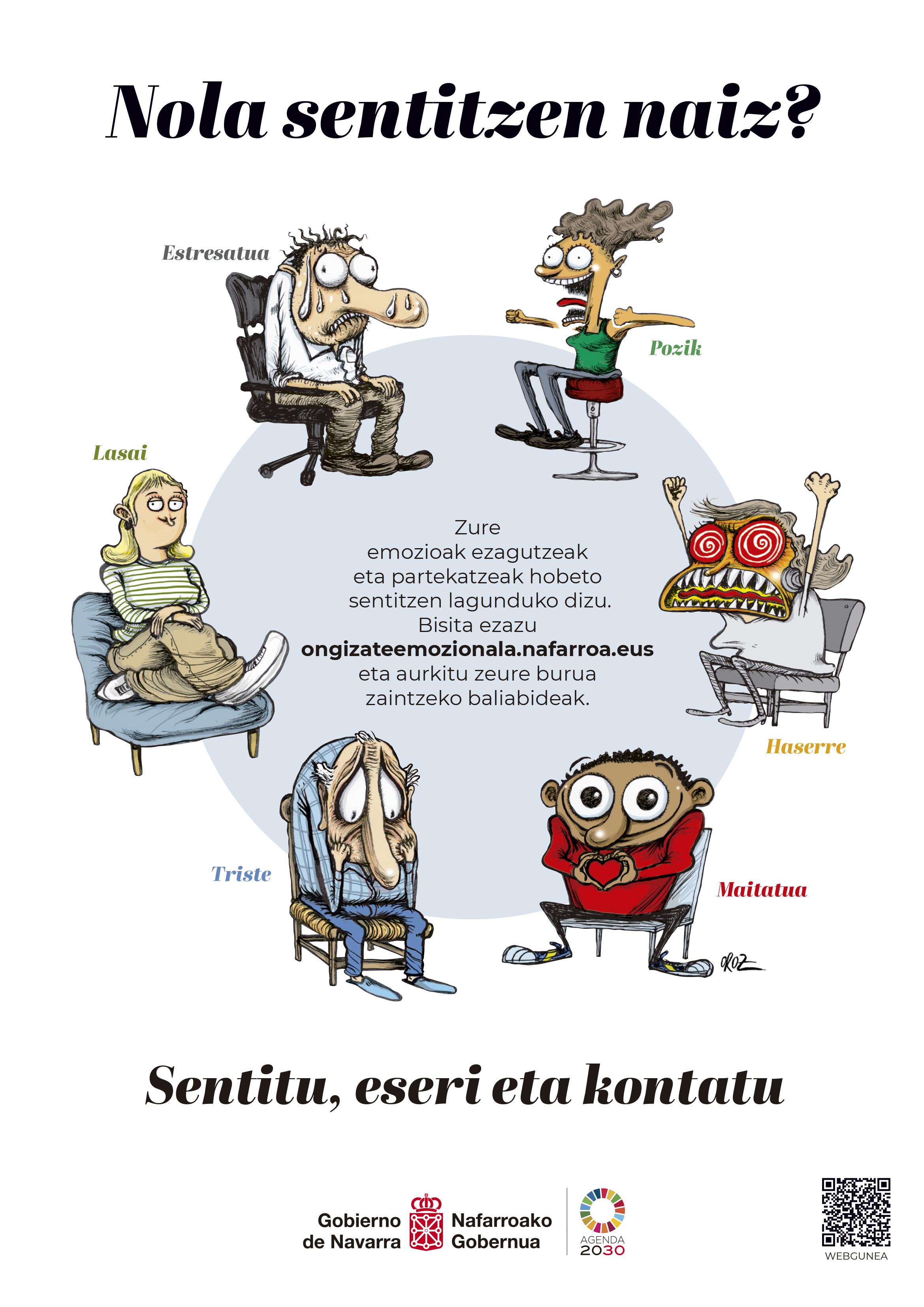 El primer paso para mejorar el bienestar emocional es identificar y compartir las emociones. Para promover esta reflexión, el ISPLN desarrollará la mencionada campaña informativa y la web bienestaremocional.navarra.es. Este proyecto, que cuenta con obras del dibujante navarro César Oroz, se dará a conocer en soportes como cartelería, marcapáginas, marquesinas y MUPIS, televisión local, radio musical, prensa digital, redes sociales y Spotify.