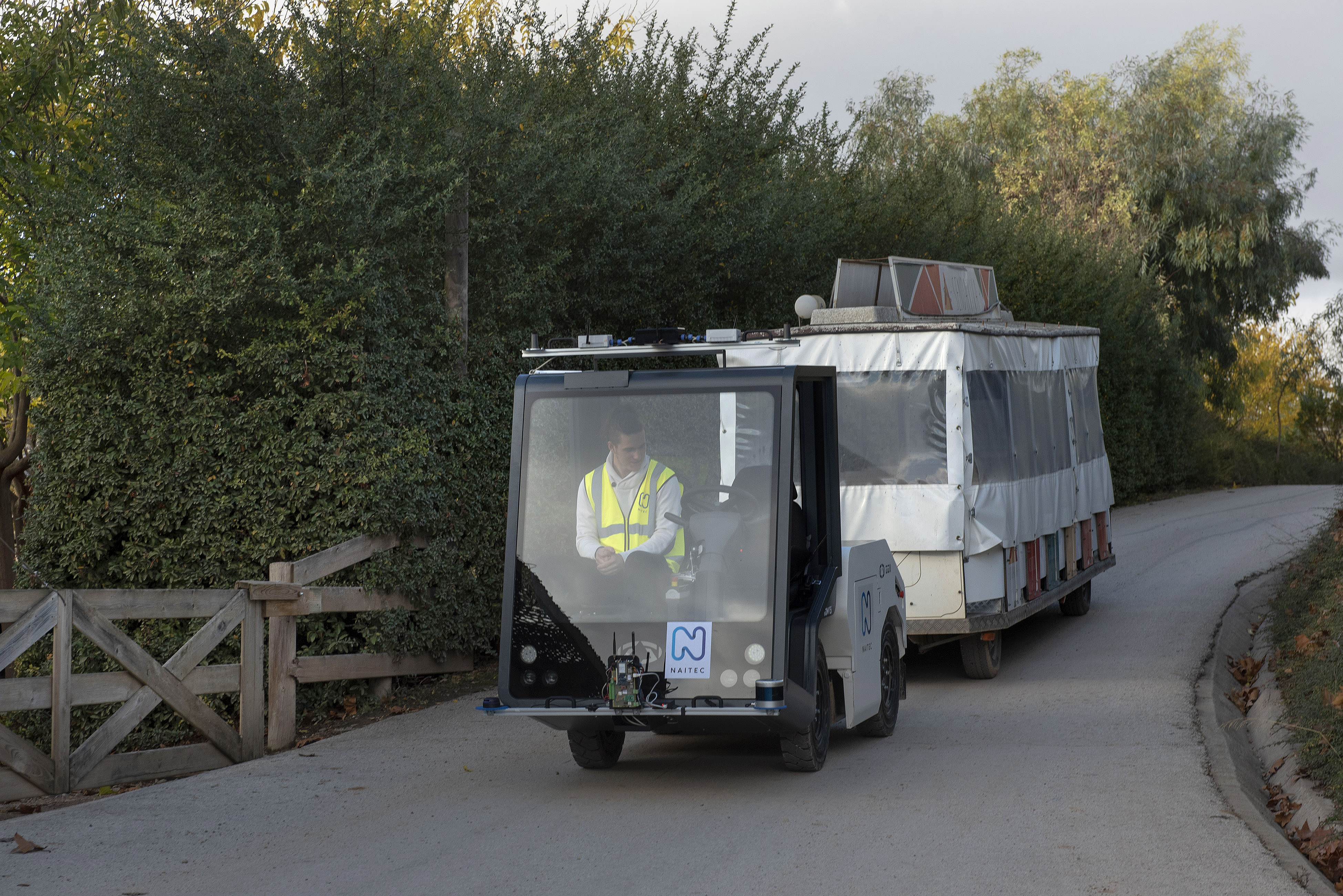 El vehículo realiza de manera autónoma una ruta circular preestablecida con paradas intermedias para el futuro embarque de los pasajeros. Un operario autorizado se sitúa en la cabina del vehículo tractor al cargo de los controles, garantizando la seguridad en todo momento.