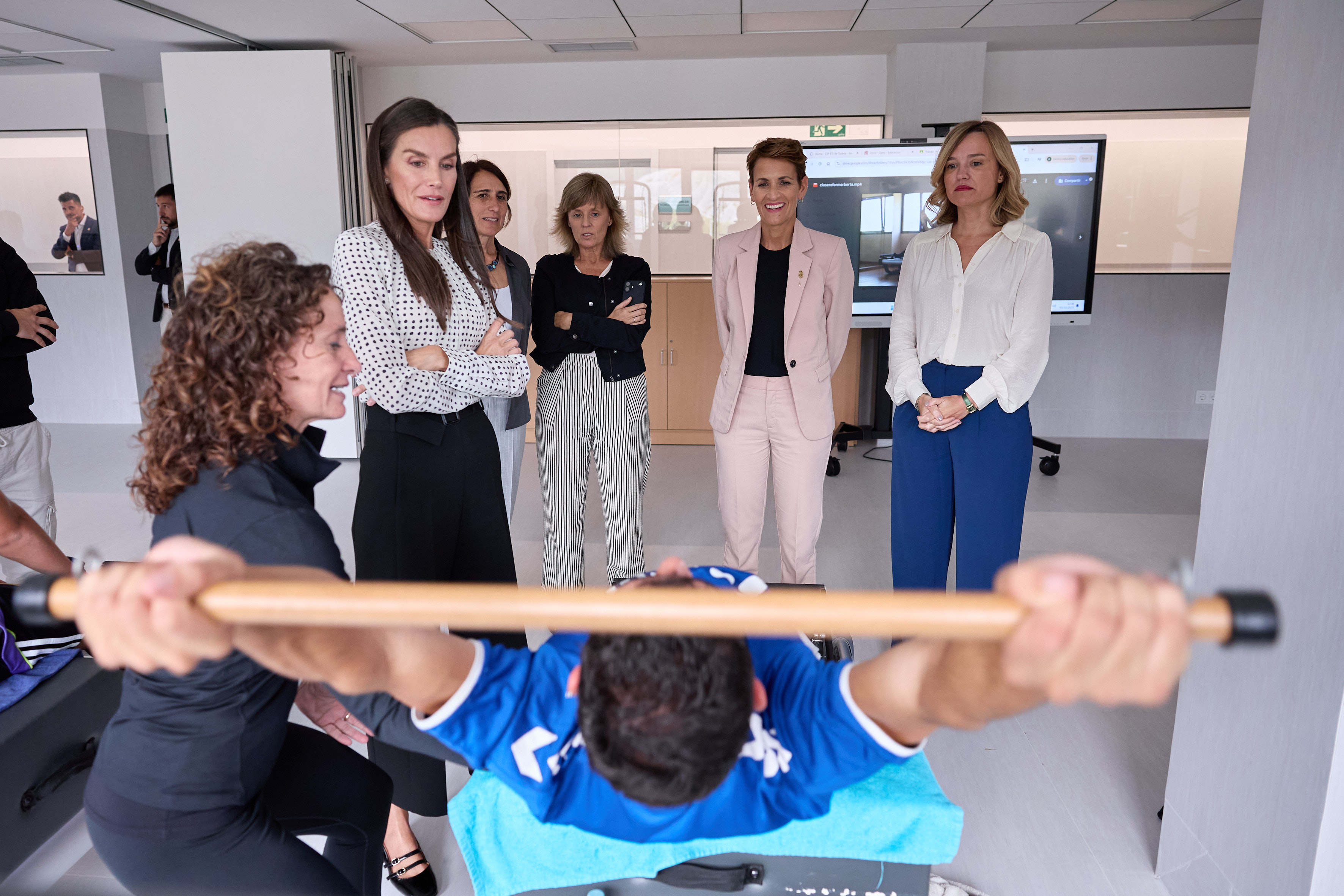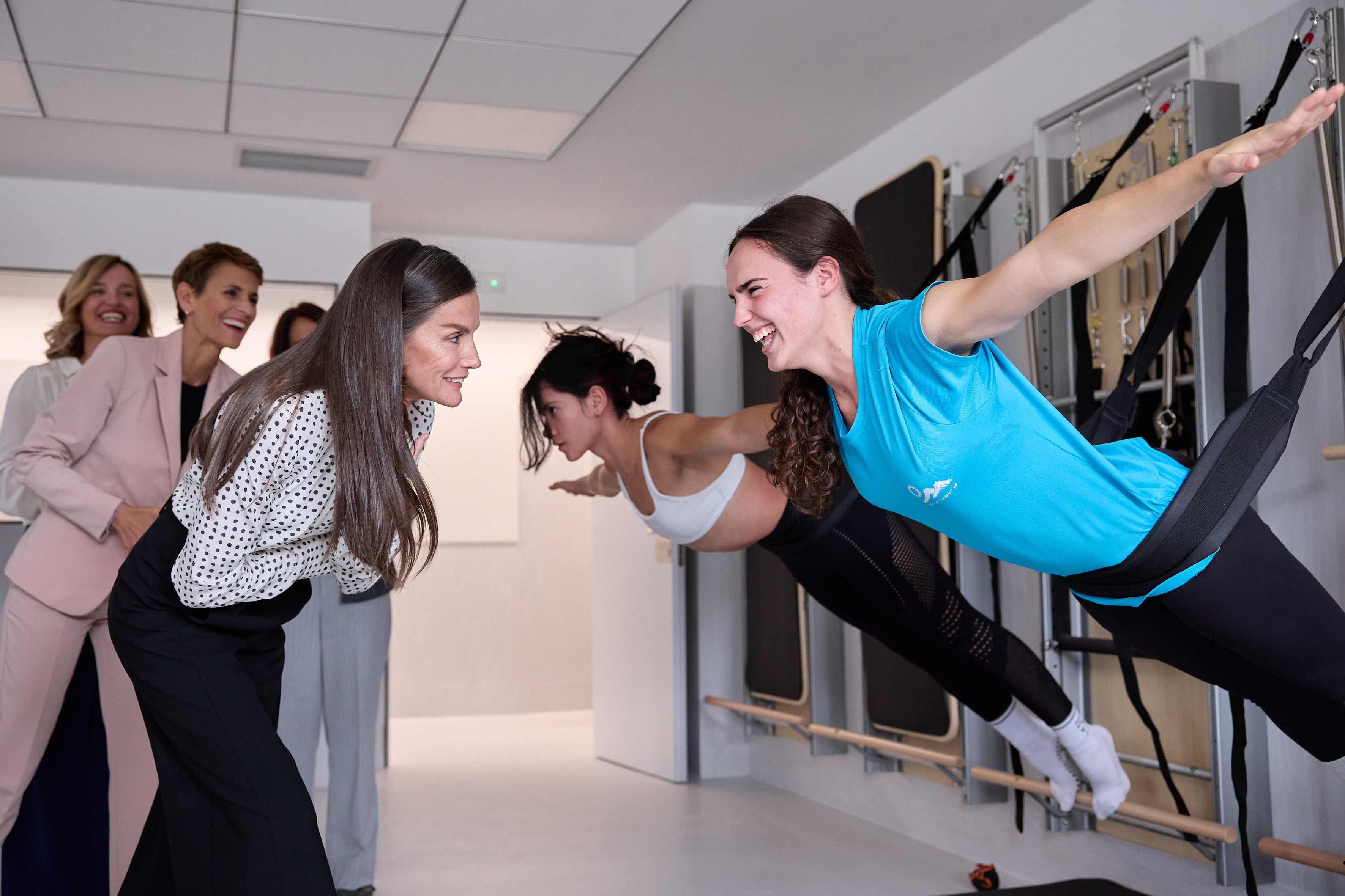 Tras la reunión mantenida, Su Majestad la Reina ha realizado una visita por las diferentes instalaciones del centro. Así, ha podido conocer de primera mano al alumnado del Grado Superior de Acondicionamiento Físico, en una clase de fitness y otra de pilates. Asimismo, también ha tenido la oportunidad de contemplar una muestra de un proyecto intermodular de mecatrónica, a cargo de los y las estudiantes del Grado Superior de Mecatrónica Industrial.