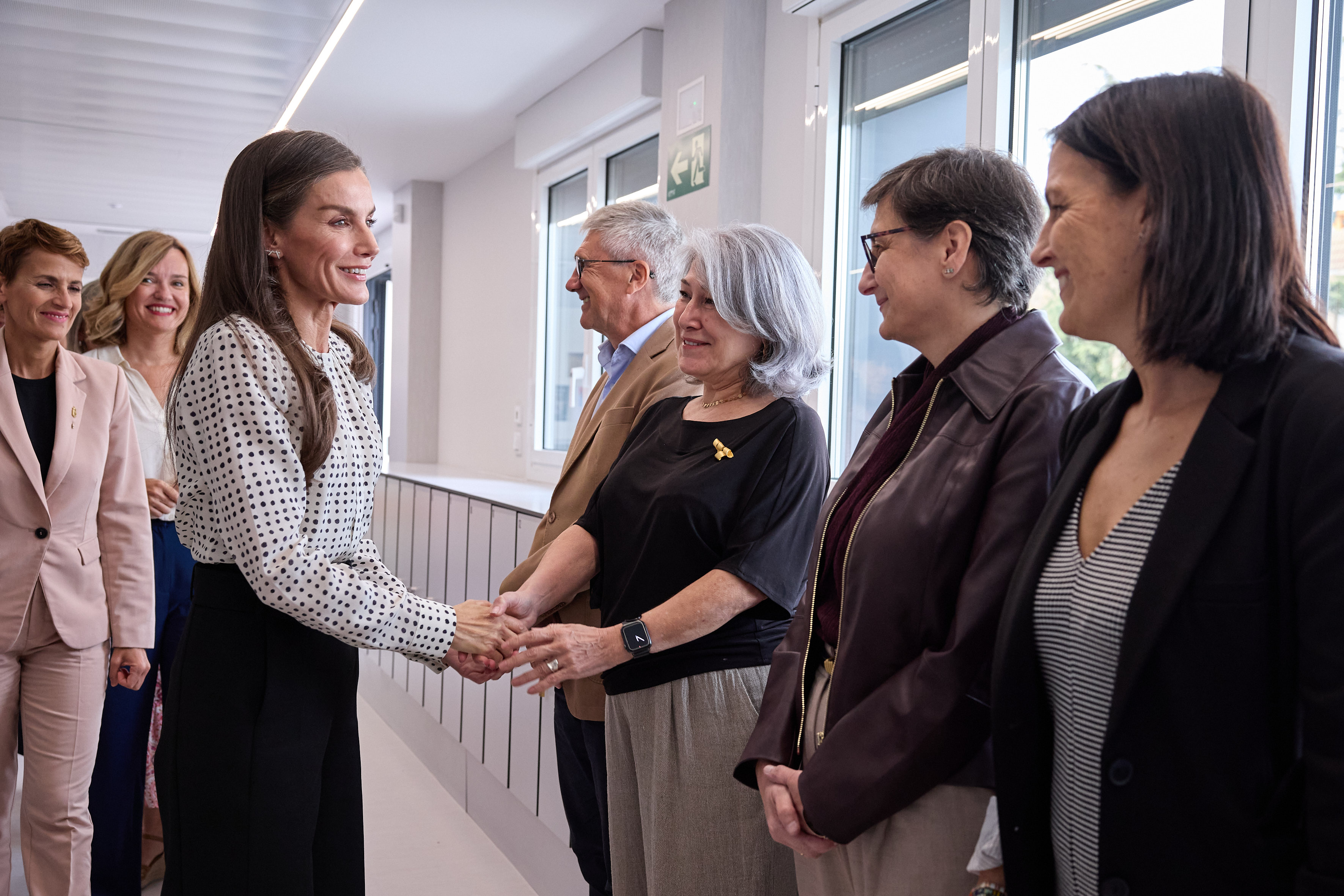 Tras un saludo realizado en la entrada del centro, Su Majestad ha podido mantener un breve encuentro con otras autoridades asistentes, entre las que se encontraba la delegada del Gobierno en Navarra, Alicia Echeverría, la presidenta del Consejo Escolar del Estado, Encarna Cuenca, la alcaldesa de Lumbier, Rocío Monclús, el consejero de Educación del Ejecutivo foral, Carlos Gimeno o la presidenta del Consejo Escolar de Navarra, Alicia Ruiz. Asimismo, ha estado presente en esta reunión parte del personal directivo y del profesorado del centro.