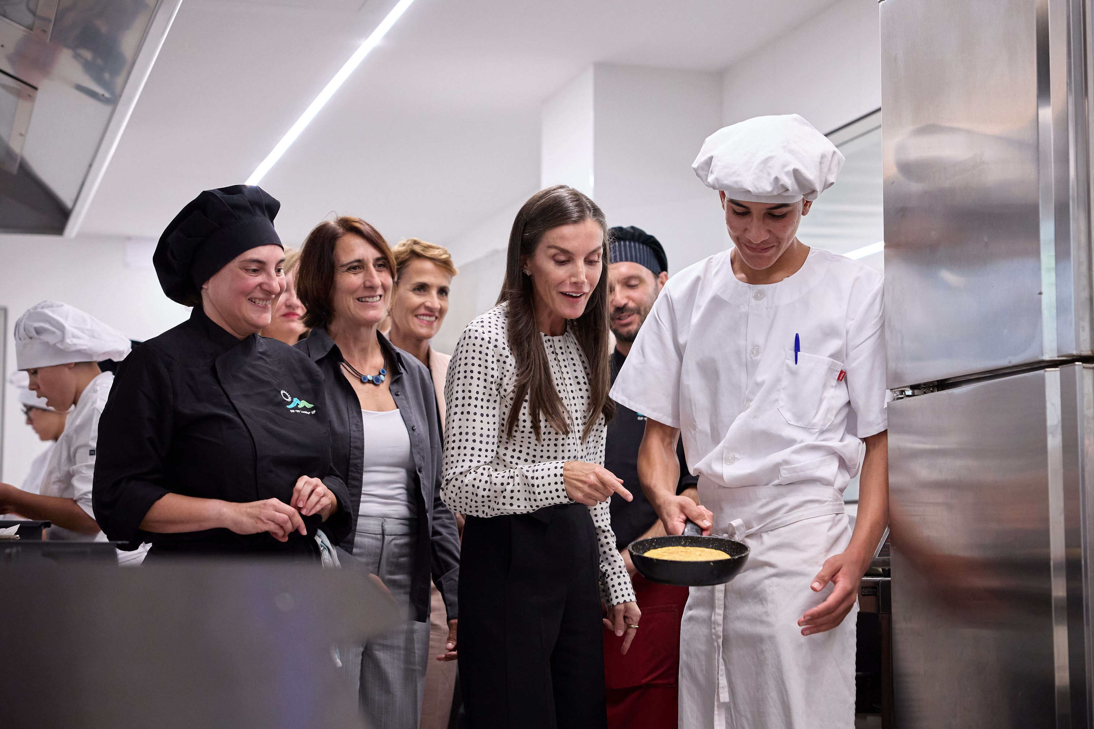 La visita ha proseguido por las nuevas instalaciones de cocina del centro, donde se ha encontrado con los y las alumnas del Grado Básico de Cocina y Restauración. Esta parte del recorrido se ha complementado además con la visita al aula de servicios y restauración, anexa a la cocina.