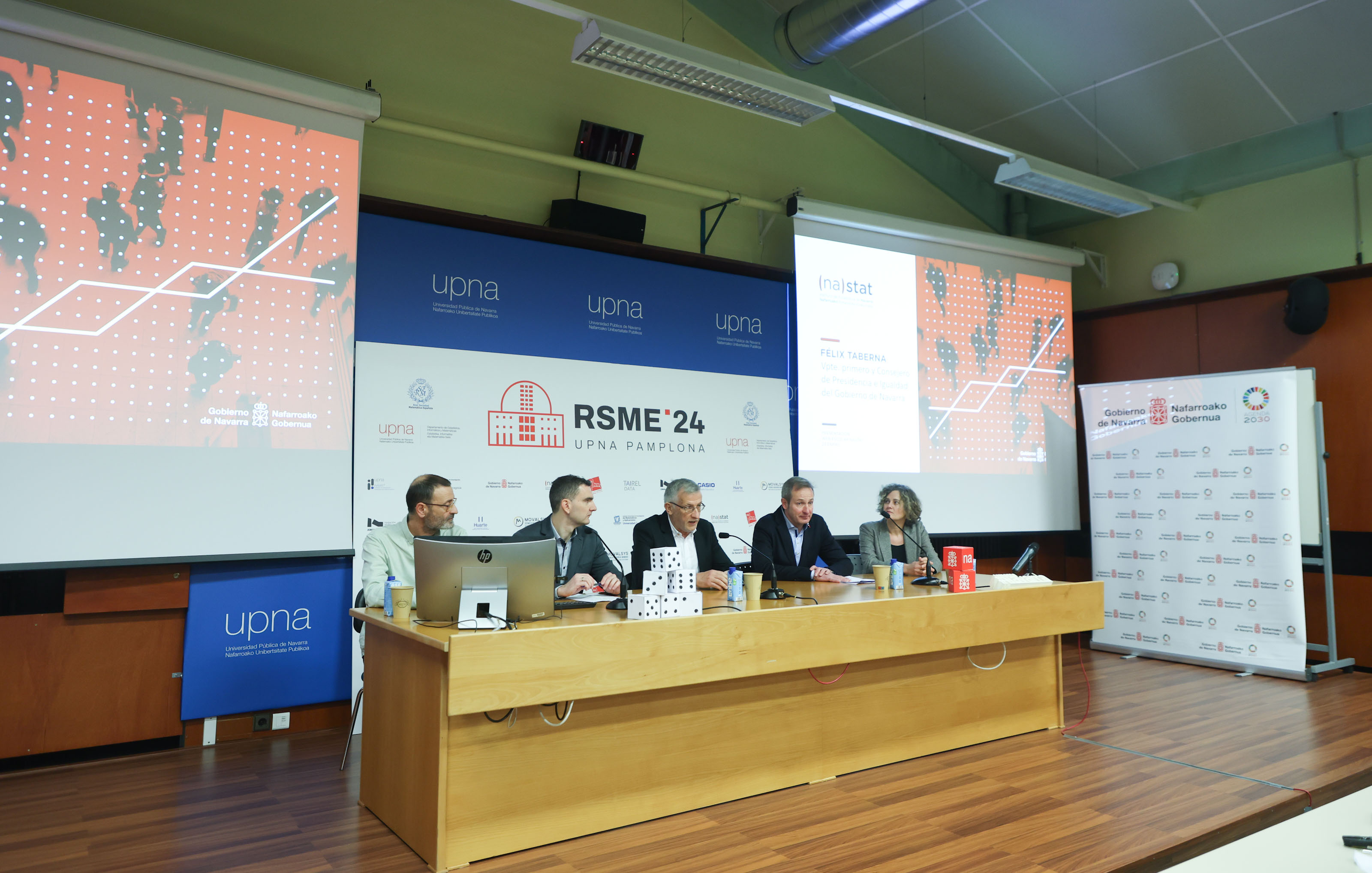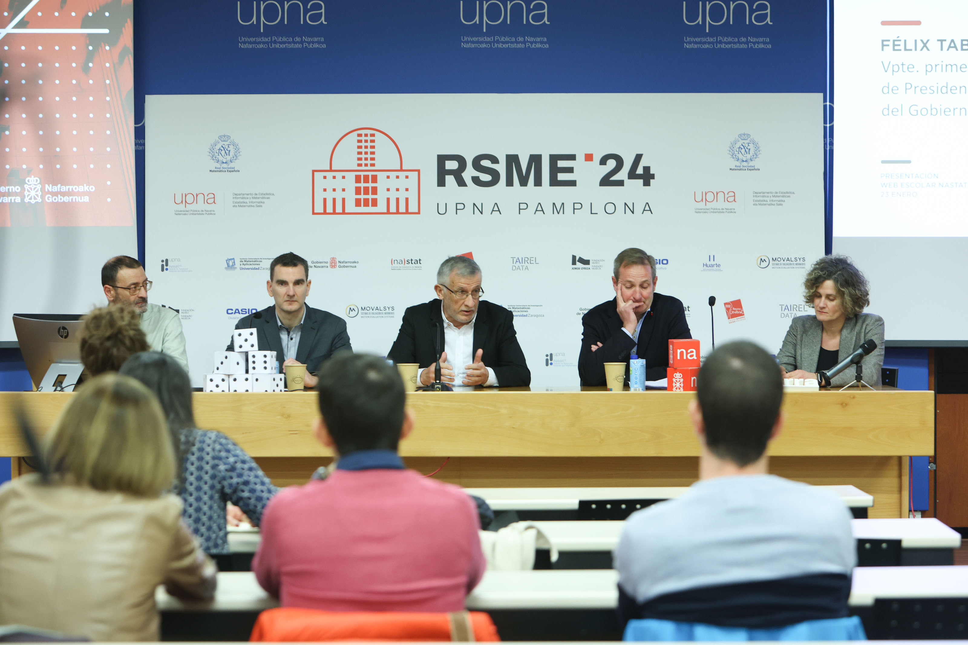 El proyecto ha sido presentado hoy en rueda de prensa por el vicepresidente primero y consejero de Presidencia e Igualdad, Félix Taberna; el director general de Formación Profesional, Digitalización y Servicios Educativos, Luis Calatayud; el director de Nastat, Pablo Cebrián; la jefa de la sección de Coordinación y Difusión Estadística, Marina Sagaseta; y Juan Carlos Ballabriga, profesor del IES Benjamín de Tudela, que ha intervenido en representación del profesorado que ha elaborado estos materiales. El acto se ha realizado en el marco del Congreso Bienal de la Real Sociedad Española de Matemáticas que se celebra en la UPNA durante esta semana.