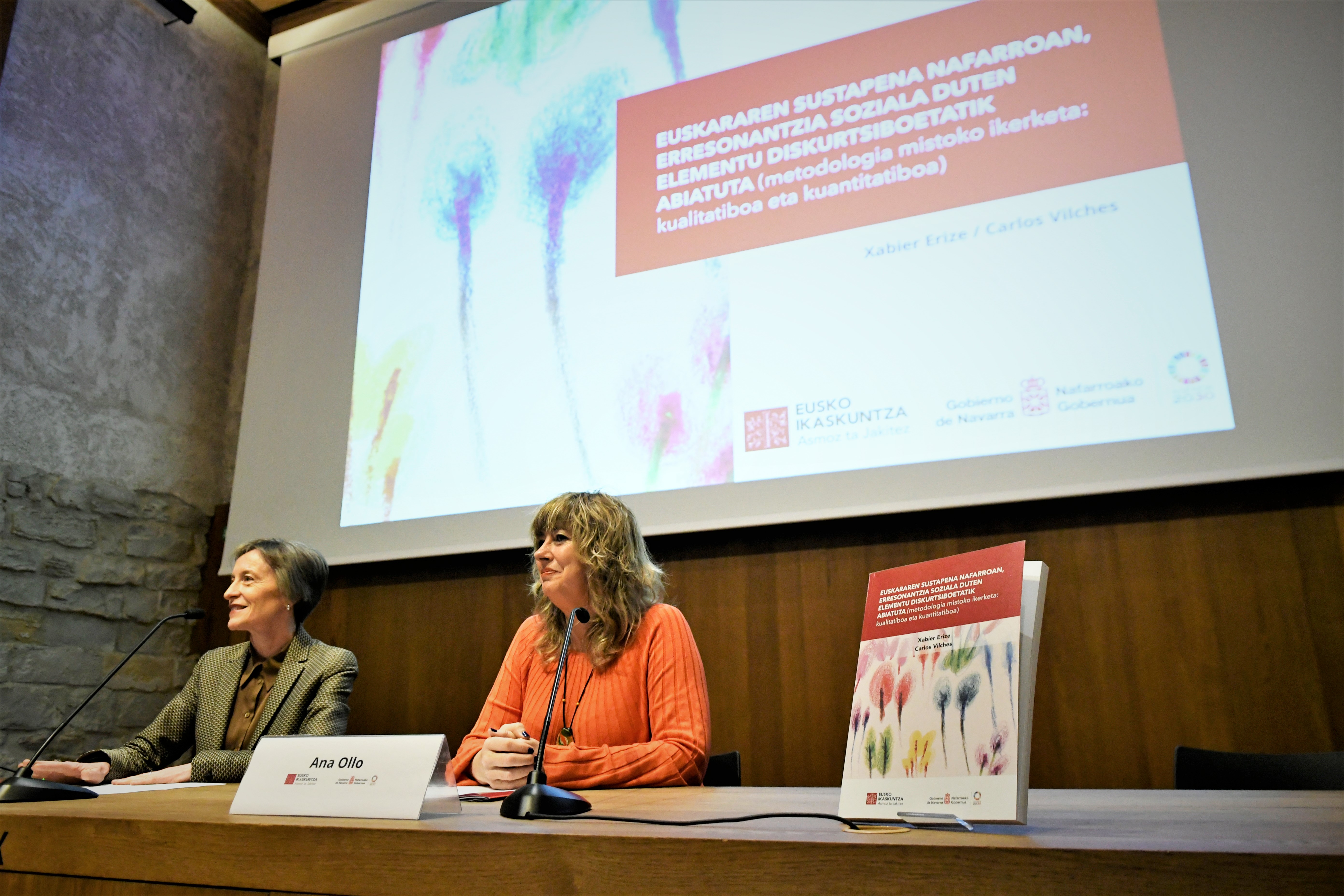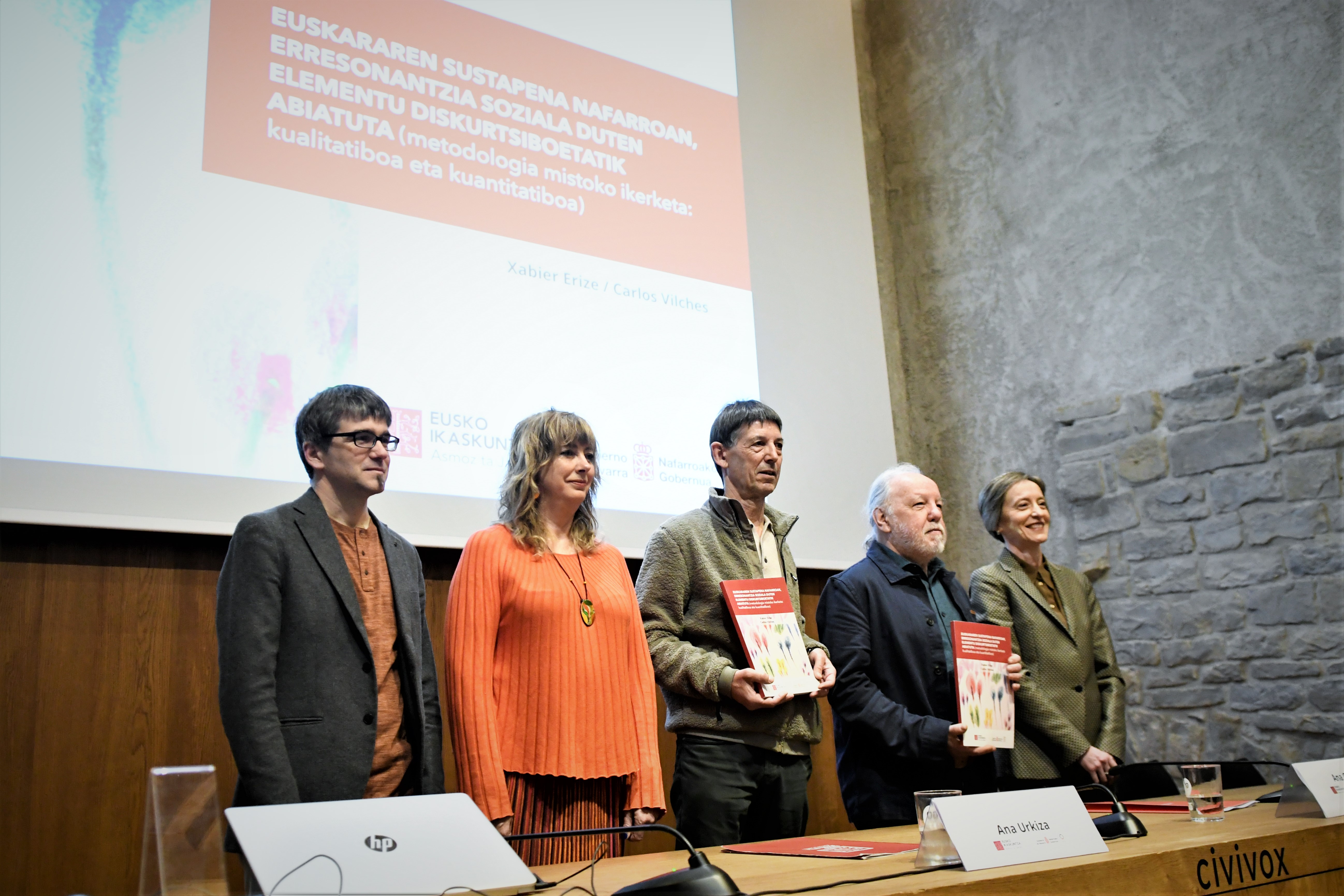La mayor parte de la población navarra (un 63%) es “favorable o muy favorable a la promoción de la lengua vasca” y solo un 17% está en contra, según un estudio realizado por Xabier Erize y Carlos Vilches en el marco del convenio entre Eusko Ikaskuntza y el Departamento de Memoria y Convivencia, Acción Exterior y Euskera del Gobierno de Navarra. Esta es la principal conclusión de la investigación orientada a un mejor conocimiento de la realidad sociolingüística de la Comunidad Foral y de los valores con mayor resonancia entre la ciudadanía en torno al fomento del euskera. En la presentación de este trabajo, que ha tenido lugar este martes en el Palacio del Condestable de Pamplona / Iruña, han intervenido la presidenta de Eusko Ikaskuntza, Ana Urkiza; la vicepresidenta y consejera de Memoria y Convivencia, Acción Exterior y Euskera del Gobierno de Navarra, Ana Ollo; los investigadores y directores científicos del proyecto Xabier Erize y Carlos Vilches; así como el director gerente de Euskarabidea-Instituto Navarro del Euskera, Javier Arakama.