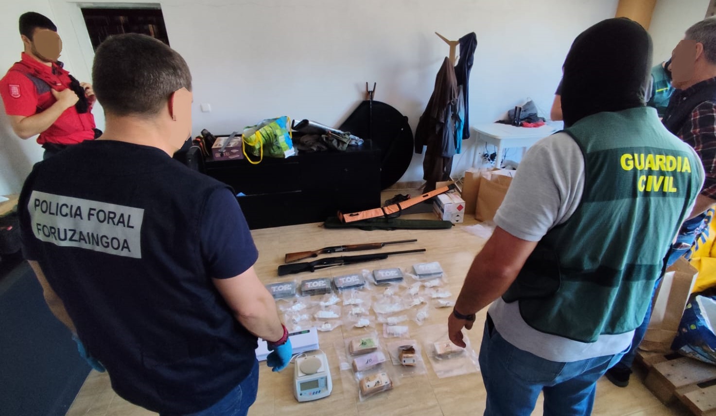 Días después era detenido en Tudela otro de los miembros de la organización, cuya misión era la de distribuir la cocaína en la Ribera de Navarra y zonas limítrofes. Fruto de las averiguaciones se realizaba el registro judicial de una nave en la que se incautaron 7 kg de cocaína, 43.000 € en metálico, dos vehículos de alta gama y dos escopetas (foto anterior). Finalmente, dos personas más fueron detenidas en Imárcoain y Corella, con menor peso dentro de la trama.