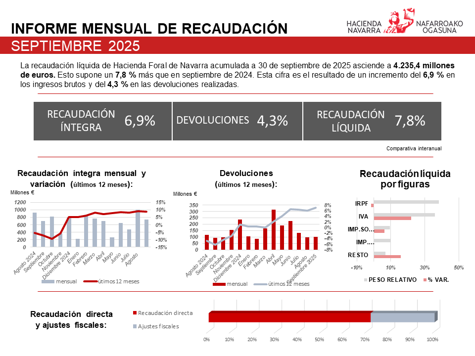 Navarra cerró el mes de septiembre con una recaudación líquida acumulada de 4.235,4 millones de euros. Frente a los 3.929,7 millones ingresados hasta septiembre del año 2024, esta cantidad representa un incremento del 7,8% en términos interanuales y es fruto de un aumento del 6,9% en la recaudación íntegra acumulada y de un 4,3% en las devoluciones.