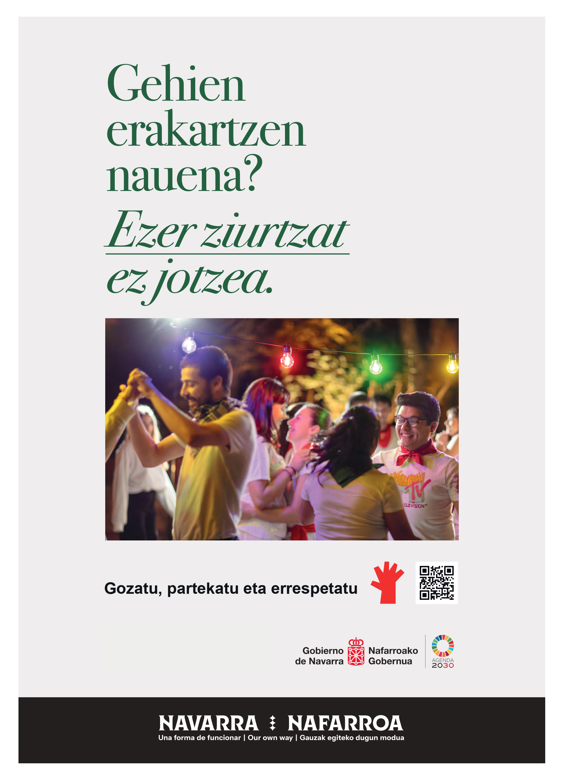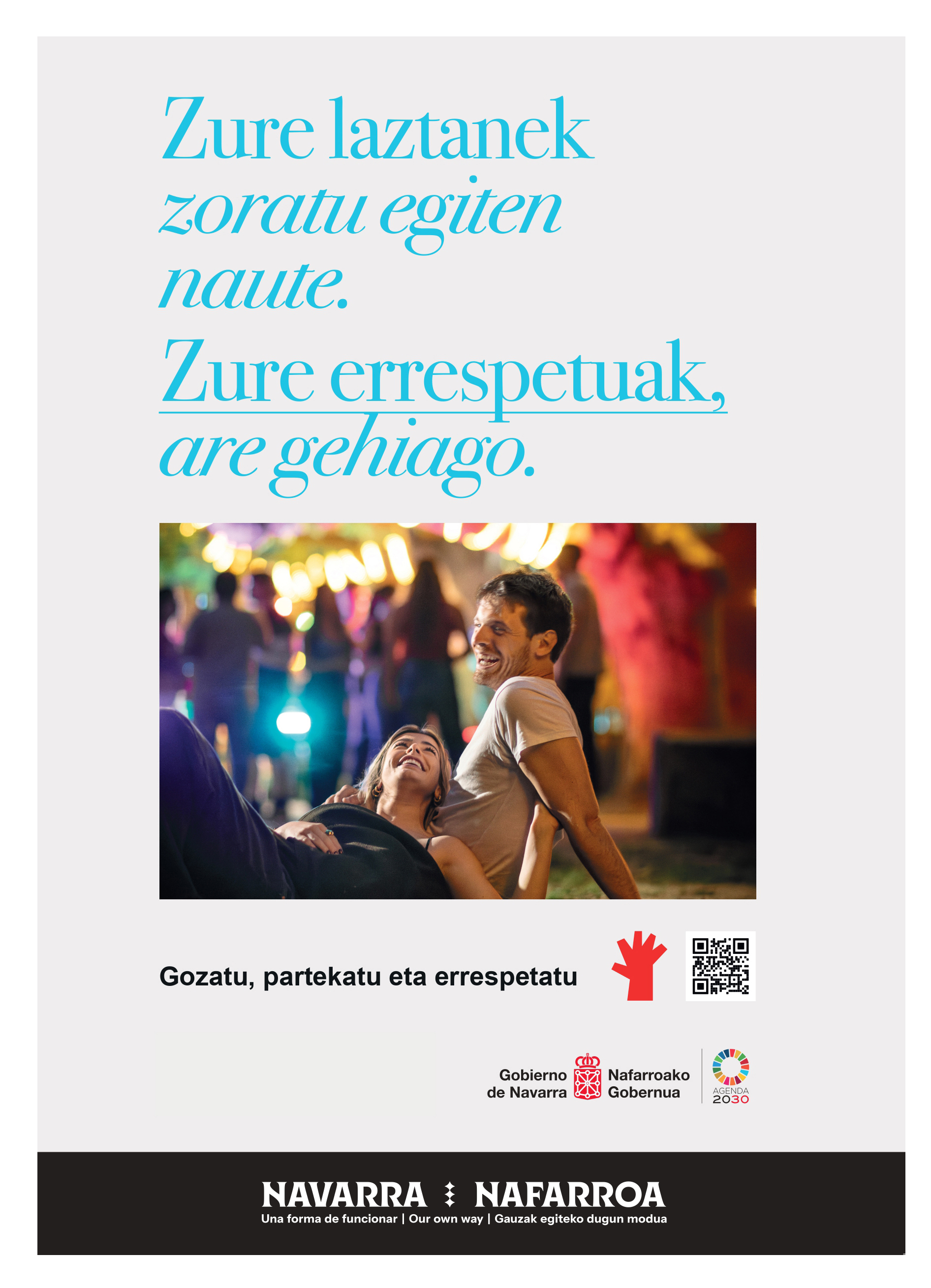 Bajo el lema ‘En Navarra… Disfruta, comparte y respeta’, el Gobierno de Navarra invita a la población a adoptar una actitud responsable y respetuosa en sus relaciones coincidiendo con unas fechas en las que aumentan los eventos festivos y se incrementan las interacciones entre las personas en los momentos de ocio.
