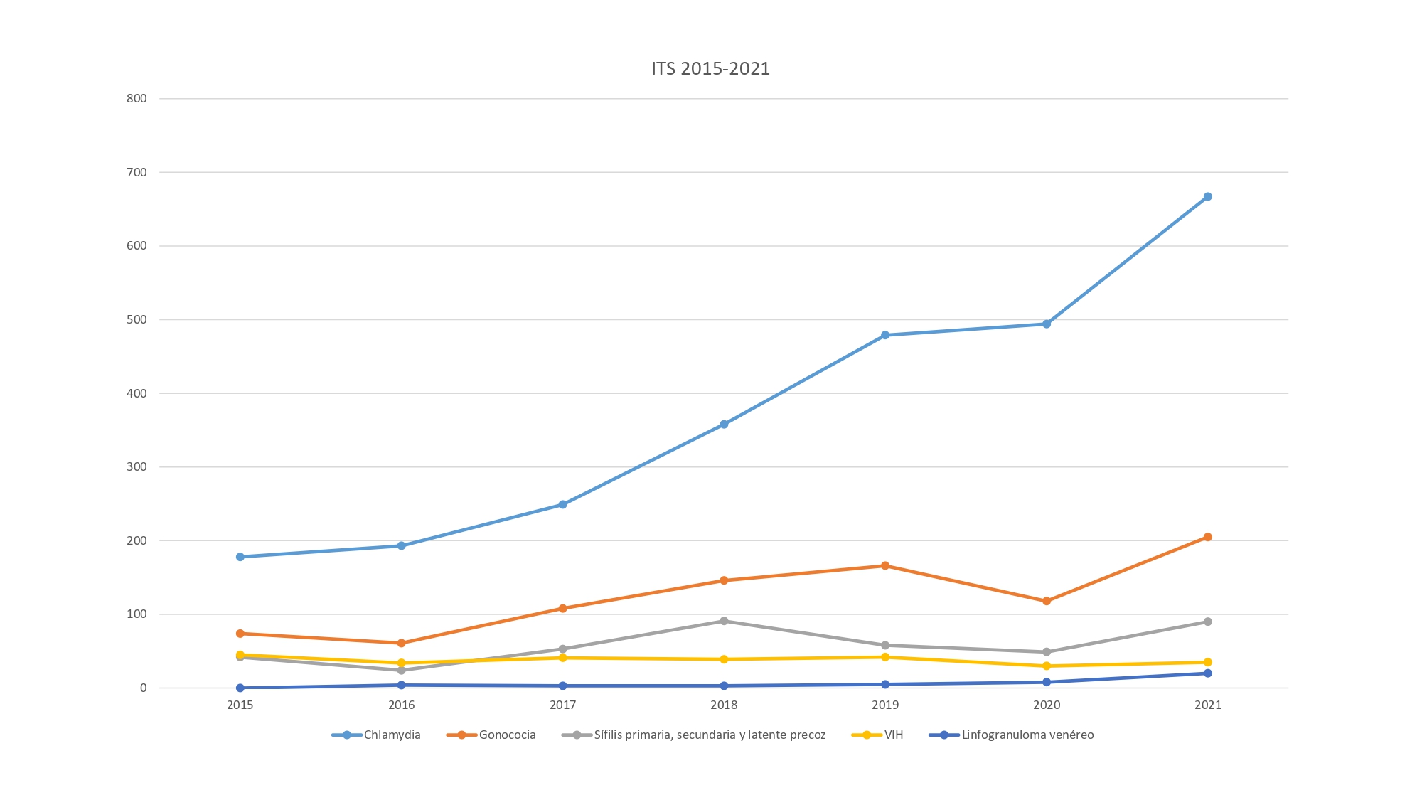 En los datos recogidos en el informe de Salud Pública, destaca el importante crecimiento de alguna de estas infecciones entre 2015 y 2021, como es el caso de la chlamydia, la ITS con mayor incidencia entre las recogidas, y cuyo número de casos casi se ha cuadruplicado, al pasar de los 178 en el primero de los años de ese período a los 667 del año pasado.
