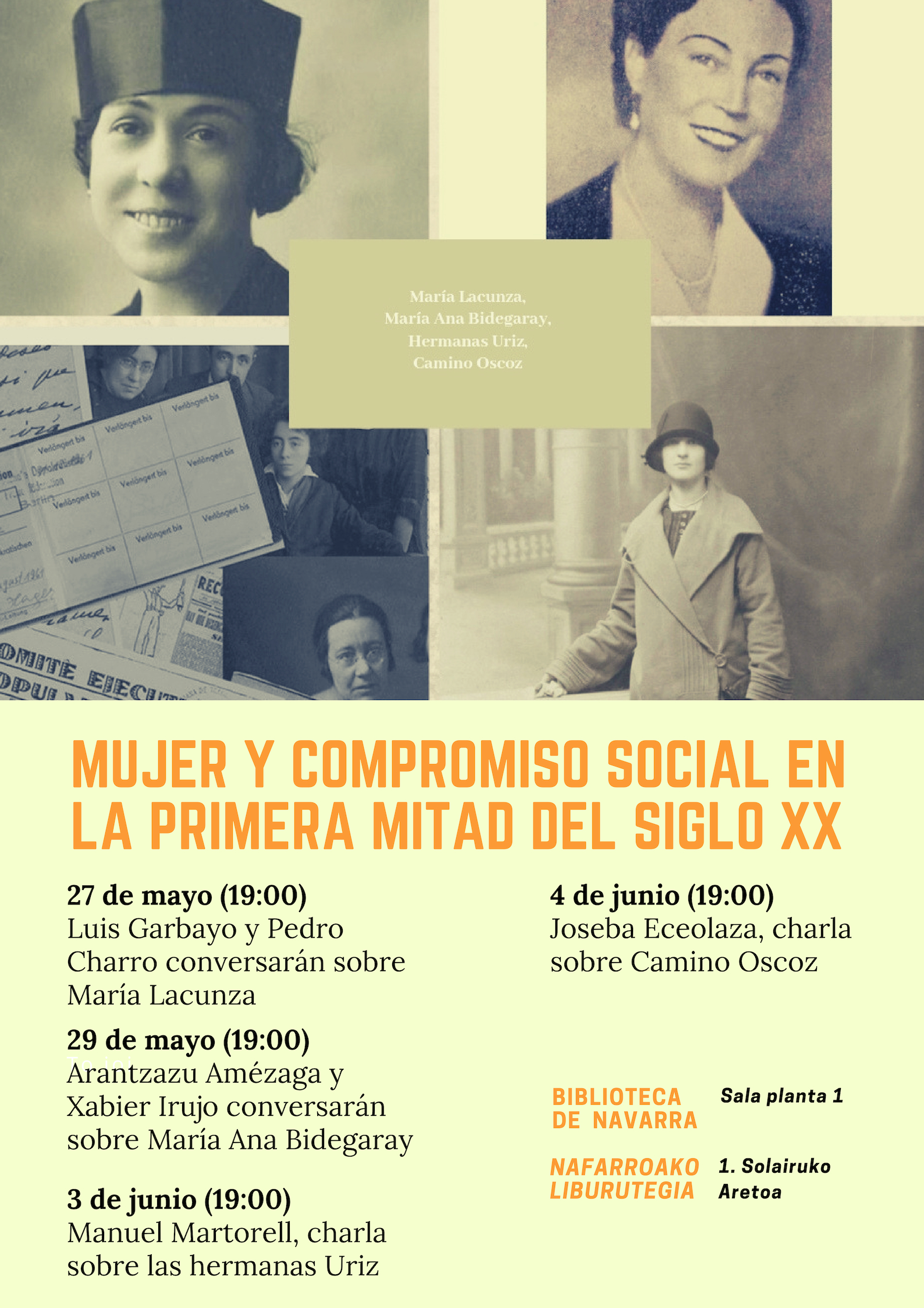 Por último, el tercero de los ciclos es el titulado “Mujer y compromiso social en la primera mitad del siglo XX”. Constará de cuatro charlas y una exposición en la que se hará un repaso a las biografías de cuatro mujeres muy relevantes en distintos ámbitos. Luis Garbayo conversará con Pedro Charro sobre María Lacunza, el 27 de mayo; y Arantzazu Amézaga con Xabier Irujo sobre María Ana Bidegaray, el 29 de mayo. Además, Manuel Martorell dará una charla el 3 de junio, sobre las hermanas Uriz Pi, y Joseba Eceolaza analizará, el 4 de junio, distintos momentos de la vida de la maestra represaliada Camino Oscoz.
