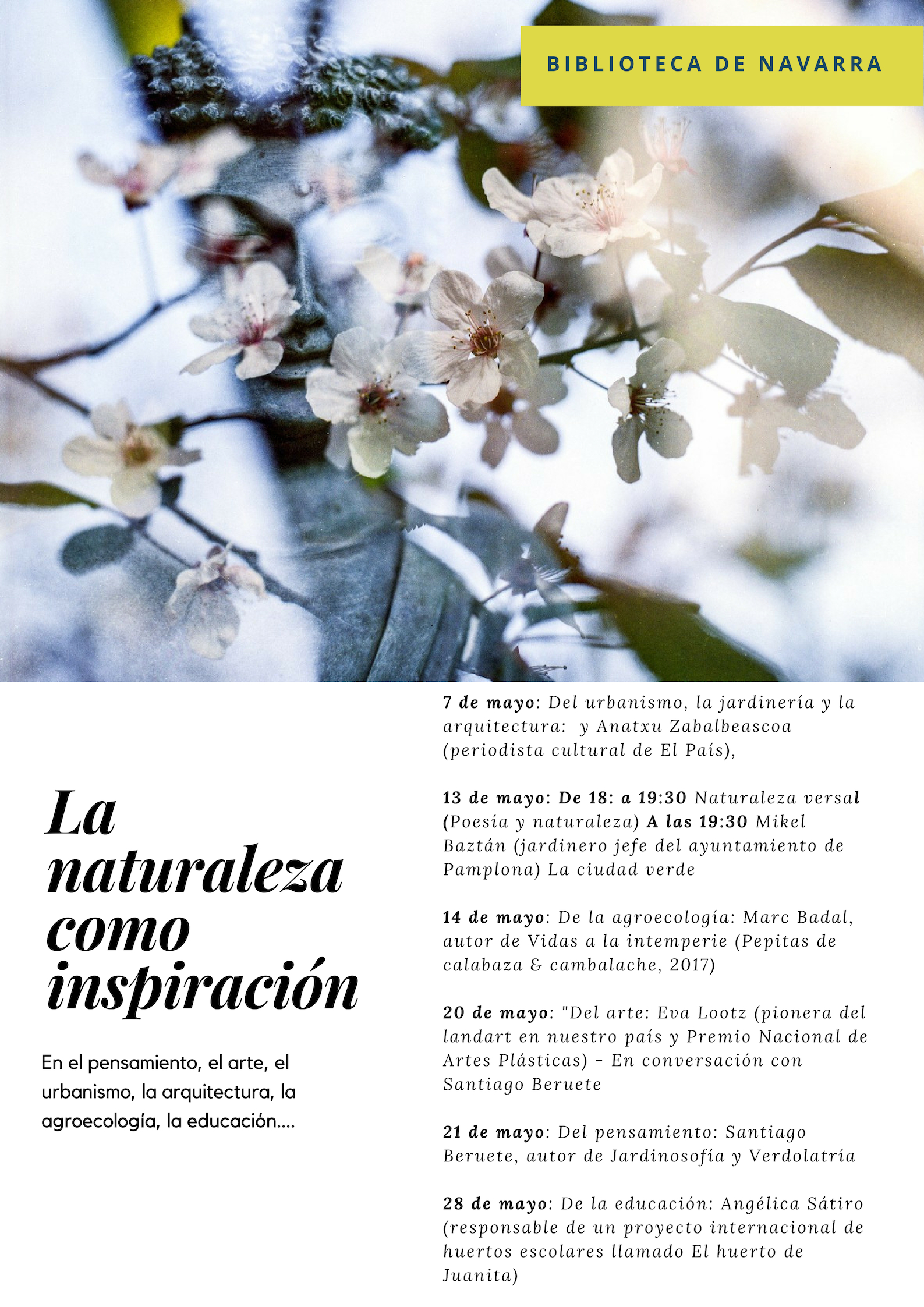 Santiago Beruete conversará con la artista Eva Lootz, Premio Nacional de Artes Plásticas, sobre la naturaleza y el arte en un acto que se celebrará el 20 de mayo. El día 21, el mismo Beruete, autor de los libros “Jardinosofía” y “Verdolatría” disertará sobre la naturaleza en la filosofía y el pensamiento. La pedagoga y experta en creatividad Angélica Sátiro, responsable de un proyecto titulado “El jardín de Juanita”, hablará el 28 de mayo de la importancia de tener en cuenta el mundo natural en las escuelas.urante el mes de mayo.
