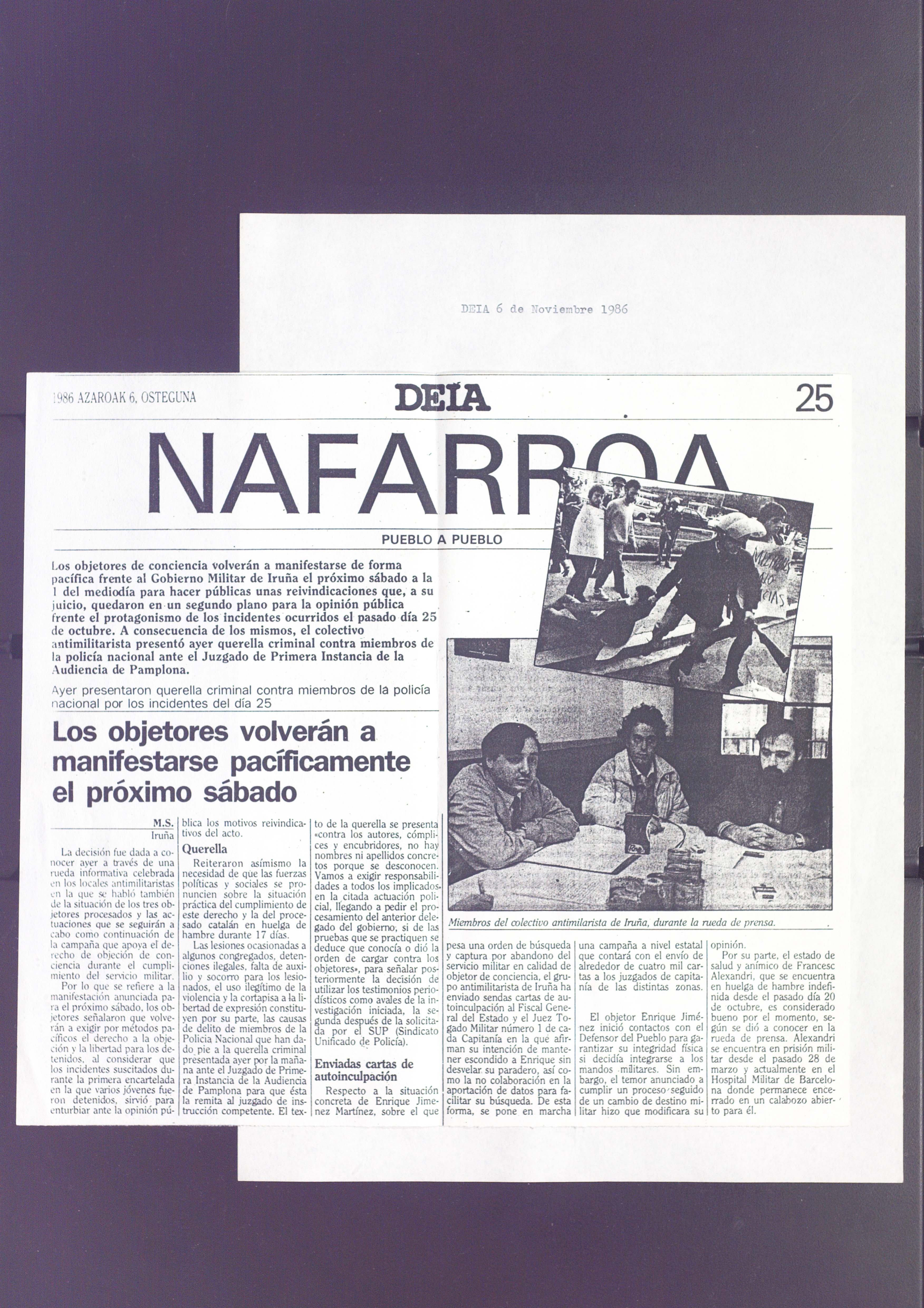 Fruto de este proyecto de investigación el Instituto ha tenido acceso a la digitalización de tres fondos muy importantes. En primer lugar, el fondo del Movimiento de Objeción de Conciencia (KEM-MOC), con un total de 1.730 documentos entre los que se encuentran actas, información de la gestión del movimiento, actividades y otros materiales recopilados, desde mediados de los años 80 a finales de los 2000. En segundo lugar, el archivo personal de Carlos Rey Bacaicoa, con casi 250 unidades documentales entre actas de asambleas y documentos sobre la gestión y las actividades organizadas por el grupo denominado, por aquel entonces, Objetores de Conciencia de Navarra. Este fondo comprende todo el periodo de gestación del movimiento de objeción de conciencia en Navarra, entre el año 1977 y 1983. Y en tercer lugar, el fondo perteneciente al abogado Ignacio Subiza Pérez, un dossier de prensa que recoge buena parte de la información publicada sobre el movimiento de objeción de conciencia e insumisión desde el año 1981 hasta 2009. El fondo está compuesto por casi 4.000 recortes de prensa pertenecientes a cerca de 40 diarios de tirada tanto local como nacional. El grueso de la documentación se centra en los años 1993 y 1994, momento en que los medios colocaron el foco informativo en la insumisión al servicio militar obligatorio y la prestación social sustitutoria.