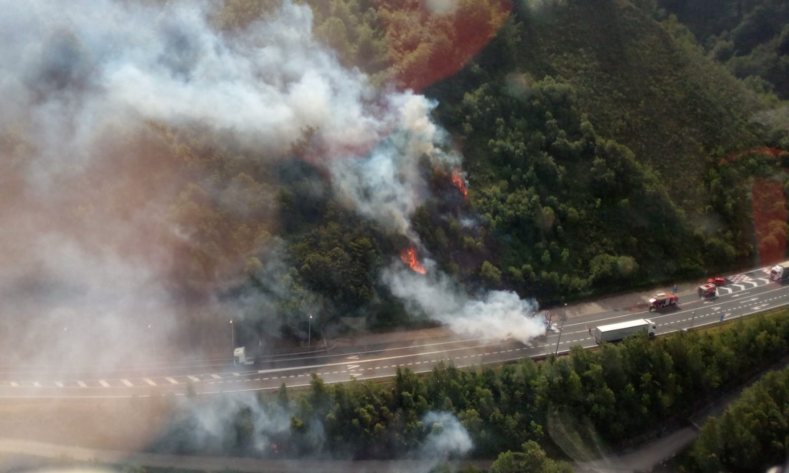 El incendio de un camión en la N-121-A se propaga a la vegetación y requiere el uso de medios aéreos para su extinción