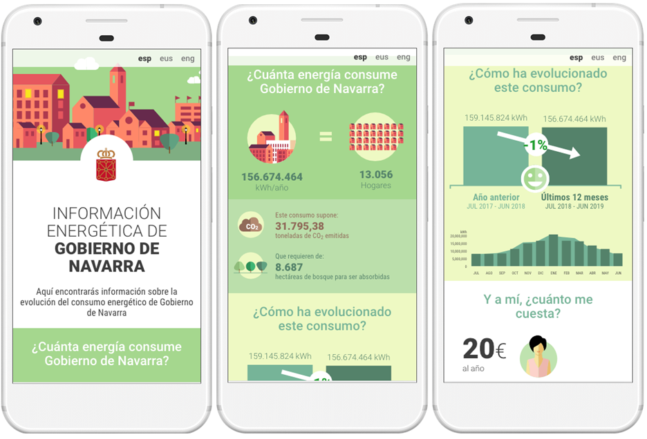 A modo de ejemplo, según los últimos datos recabados en este Portal, el conjunto de los edificios públicos del Gobierno de Navarra acumula un consumo energético de 156 GWh/año y, en los últimos doce meses, se ha reducido en un 1%. La herramienta ofrece datos en términos comparables con otros equipamientos y edificios del Gobierno de Navarra, entre los cuales se debe destacar que esta cantidad de energía consumida equivaldría al consumo energético de un total de 13.055 hogares y que dicha energía supone un gasto de 20 euros anuales a cada ciudadana o ciudadano.