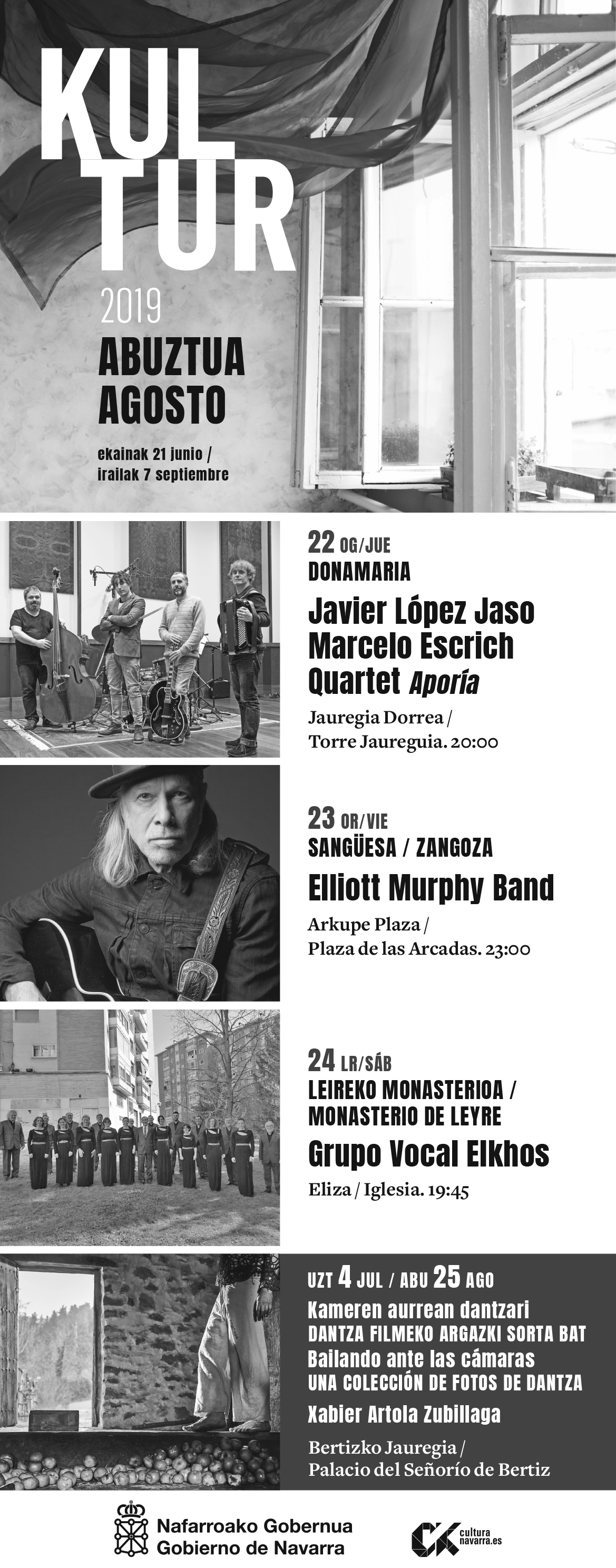 Finalmente, el grupo vocal Elkhos actúa el sábado 24 en la iglesia del Monasterio de Leyre a las 19:45. El grupo de música coral, creado en 2004, interpreta obras profanas y sacras de diversas épocas y estilos y, además, fusiona y armoniza obras del folklore vasco.