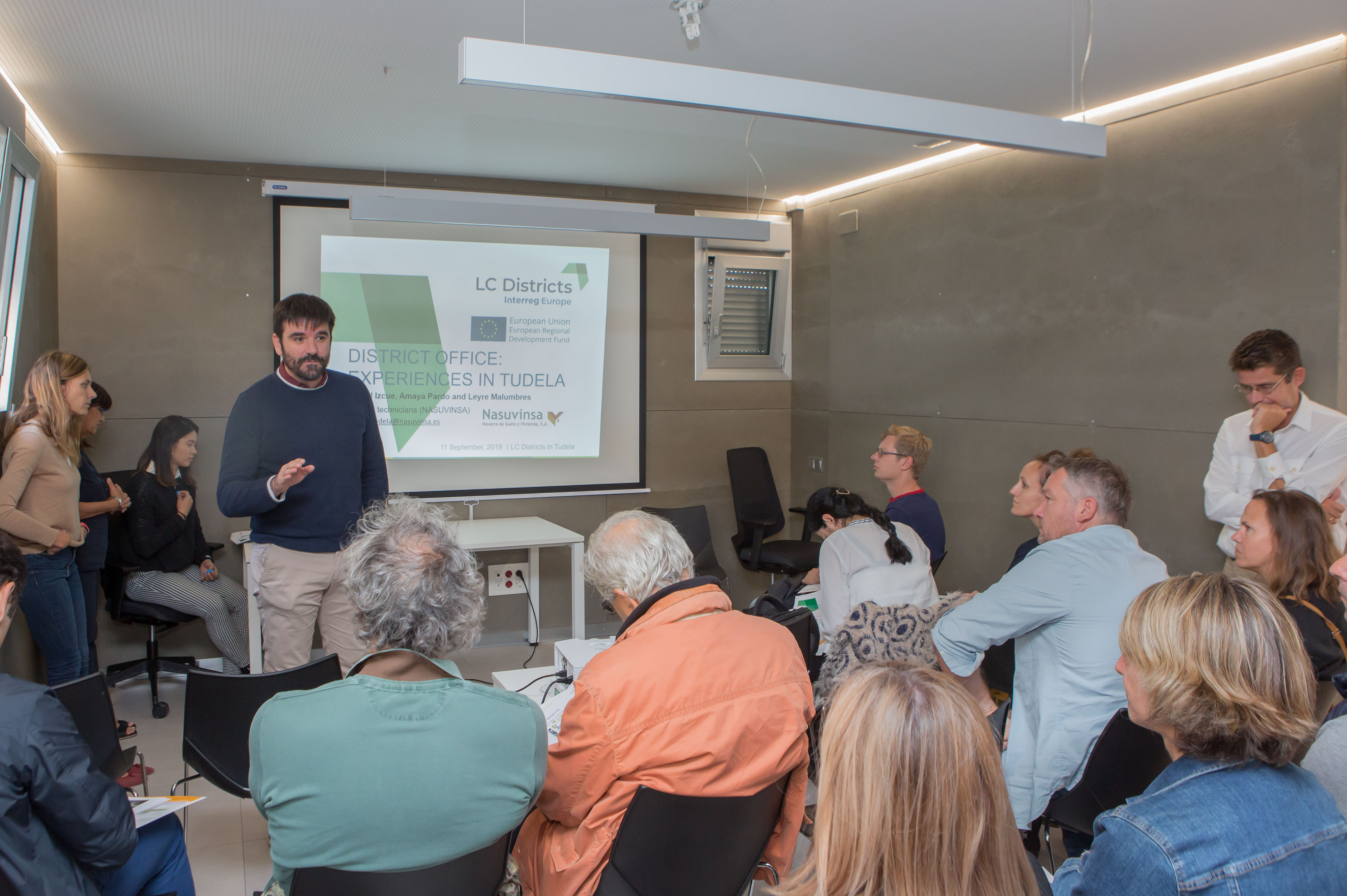 Los socios europeos de Districts han tenido ocasión de conocer in situ las experiencias que ha desarrollado Navarra durante estos últimos años en el ámbito de la transformación del parque de vivienda y la implantación de Edificios de Consumo Casi Nulo (ECCN). En este sentido, además de la visita del barrio tudelano de Lourdes, esta tarde tienen previsto acudir a las obras del primer edificio Passivhaus de vivienda pública en el Estado que Nasuvinsa está ultimando en Mutilva . Posteriormente, se desplazarán a conocer el proyecto Efidistrict de regeneración urbana y renovación de redes de calefacción que esta sociedad pública está desarrollando, asimismo, en el barrio pamplonés de la Txantrea, con más de 600 viviendas rehabilitadas hasta ahora y con previsión de duplicar esta cantidad en una segunda fase.