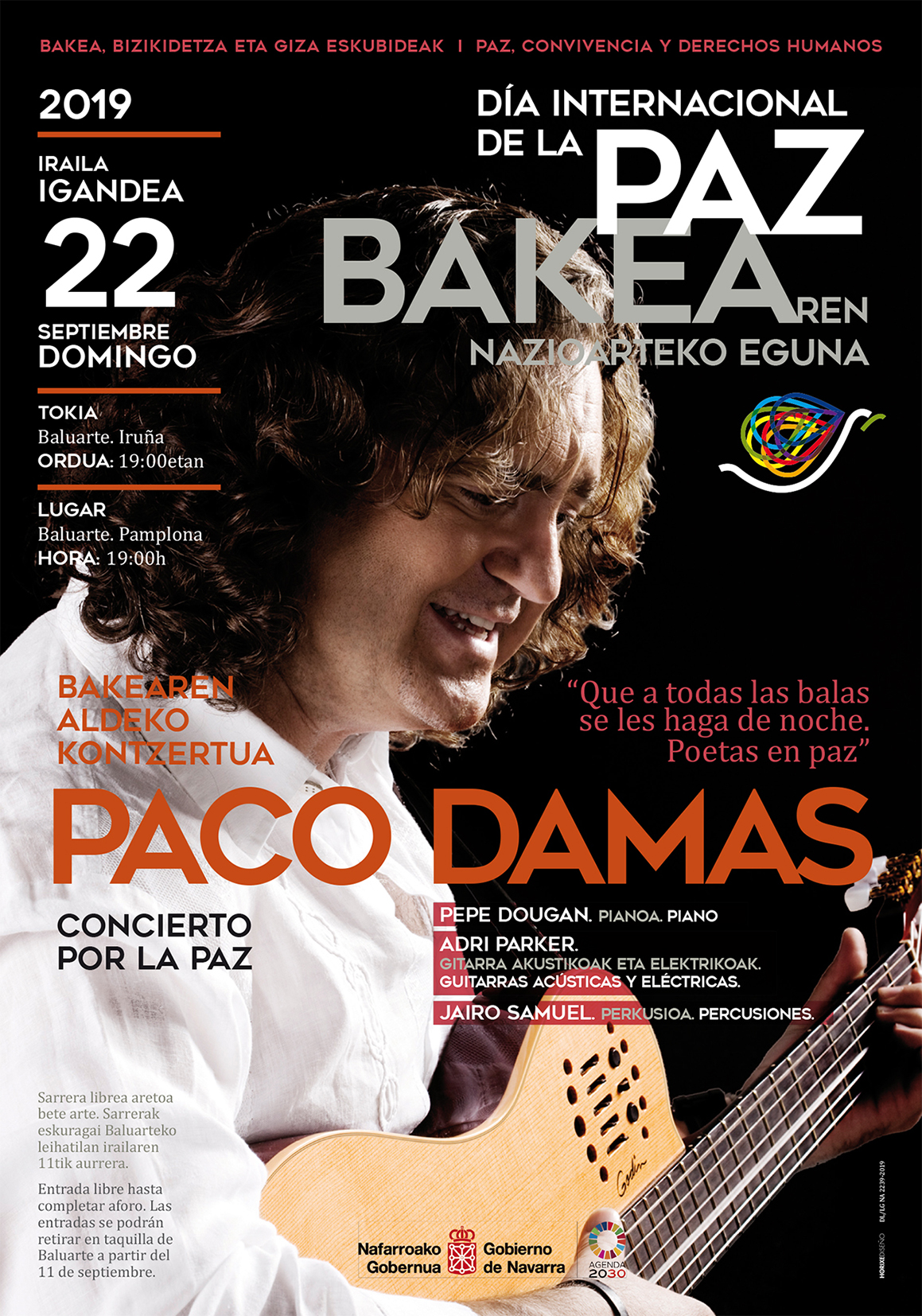 Para el concierto, el músico jienense Paco Damas recupera el título de su disco de 2012 “Que a todas las balas se les haga de noche” al que añade para el título de este recital el apéndice “Poetas en paz”. En el espectáculo intercala canciones y poemas de grandes autores y autoras que hacen un guiño a la paz como Antonio Machado, Angela Figuera, Gabriel Celaya, Miguel Hernández, Dolors Alberola, Federico García Lorca, Concha Méndez o Federico Mayor Zaragoza. Paco Damas comparte escenario con Pepe Dougan (piano), Adri Parker (guitarras acústicas y eléctricas) y Jairo Samuel (percusiones). Además, un grupo de diez personas voluntarias colaboran con el cantautor en la lectura de los poemas.