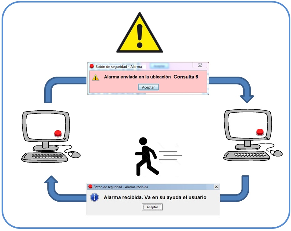 Cuando una trabajadora o trabajador se siente en riesgo pulsa en su escritorio el icono rojo del “Botón de la Seguridad” que aparece en su barra de herramientas. Al pulsarlo, envía un mensaje de solicitud de ayuda a los equipos cercanos que están conectados al mismo y permite que éstos pueden contestar desde sus ordenadores enviando un mensaje anunciando que han recibido su llamada y trasladando de esta manera tranquilidad a la persona amenazada, en primera instancia, para acercarse a ese puesto de trabajo para comprobar que todo está correcto y actuar en consecuencia, rebajando con su presencia la tensión o interviniendo si fuera necesario.