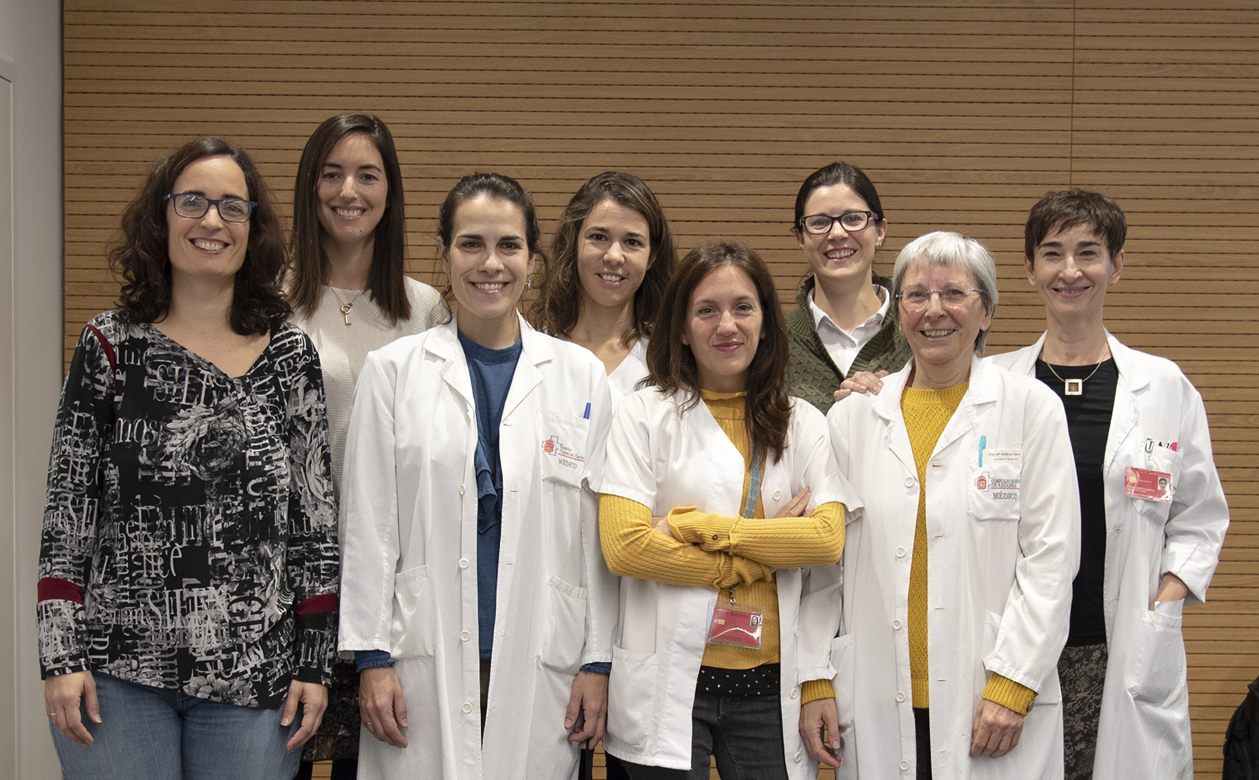 De izquierda a derecha: Esther Vicente Cemborain, técnica del Registro poblacional de Enfermedades Raras de Navarra (ISPLN); Leyre Martínez Merino, facultativa especialista del Servicio de Neurología (CHN); Virginia Garcia Solaesa, facultativa especialista del Servicio de Genética Médica (CHN); Inmaculada Pagola Lorz, facultativa especialista del Servicio de Neurología (CHN); Laura Torné Hernández, facultativa especialista del Servicio de Neurología (CHN), Consulta Monográfica de Enfermedades Neuromusculares; Itsaso Elizalde Beiras, enfermera de Atención Primaria y data manager; María A. Ramos Arroyo, jefa del Servicio de Genética Médica (CHN); Ivonne Jericó Pascual, jefa de la Sección de Hospitalización del Servicio de Neurología (CHN) e investigadora principal del proyecto y responsable de la consulta monográfica de enfermedades neuromusculares y de la Unidad Multidisciplinar de ELA.