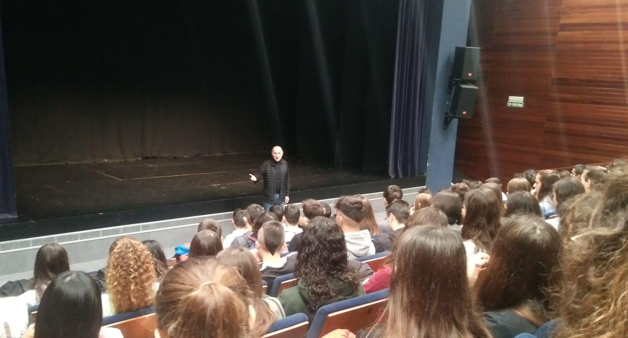 En una primera sesión matinal, el alumnado de los institutos IES Zizur BHI, Ikastola Paz de Ziganda, IESO Bardenas Reales de Cortes y Colegio María Inmaculada, ha podido disfrutar del espectáculo “Derechos Humanos”, en una sesión interactiva en la que se ha promovido la participación del público.