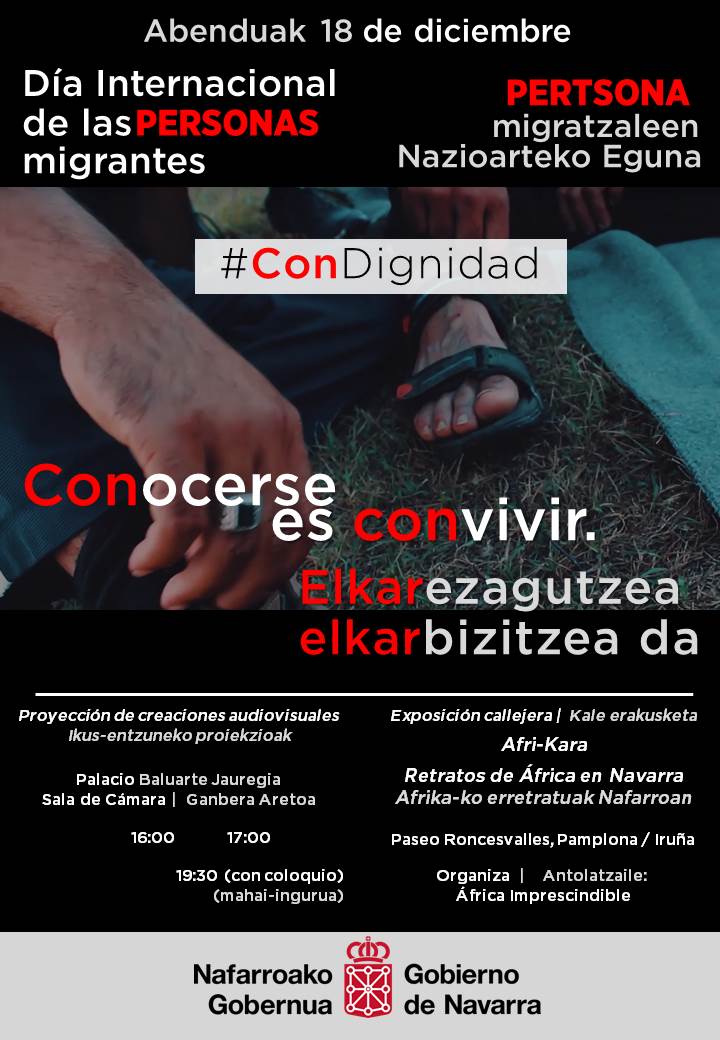 El Gobierno de Navarra, a través del Departamento de Políticas Migratorias y Justicia, conmemorará el próximo miércoles, 18 de diciembre, el Día Internacional de la Persona Migrante. Lo hará con diversas actividades, entre las que destaca la inauguración de una exposición callejera en Pamplona / Iruña y la celebración de proyecciones audiovisuales y coloquios en el Palacio de Congresos y Auditorio Baluarte.