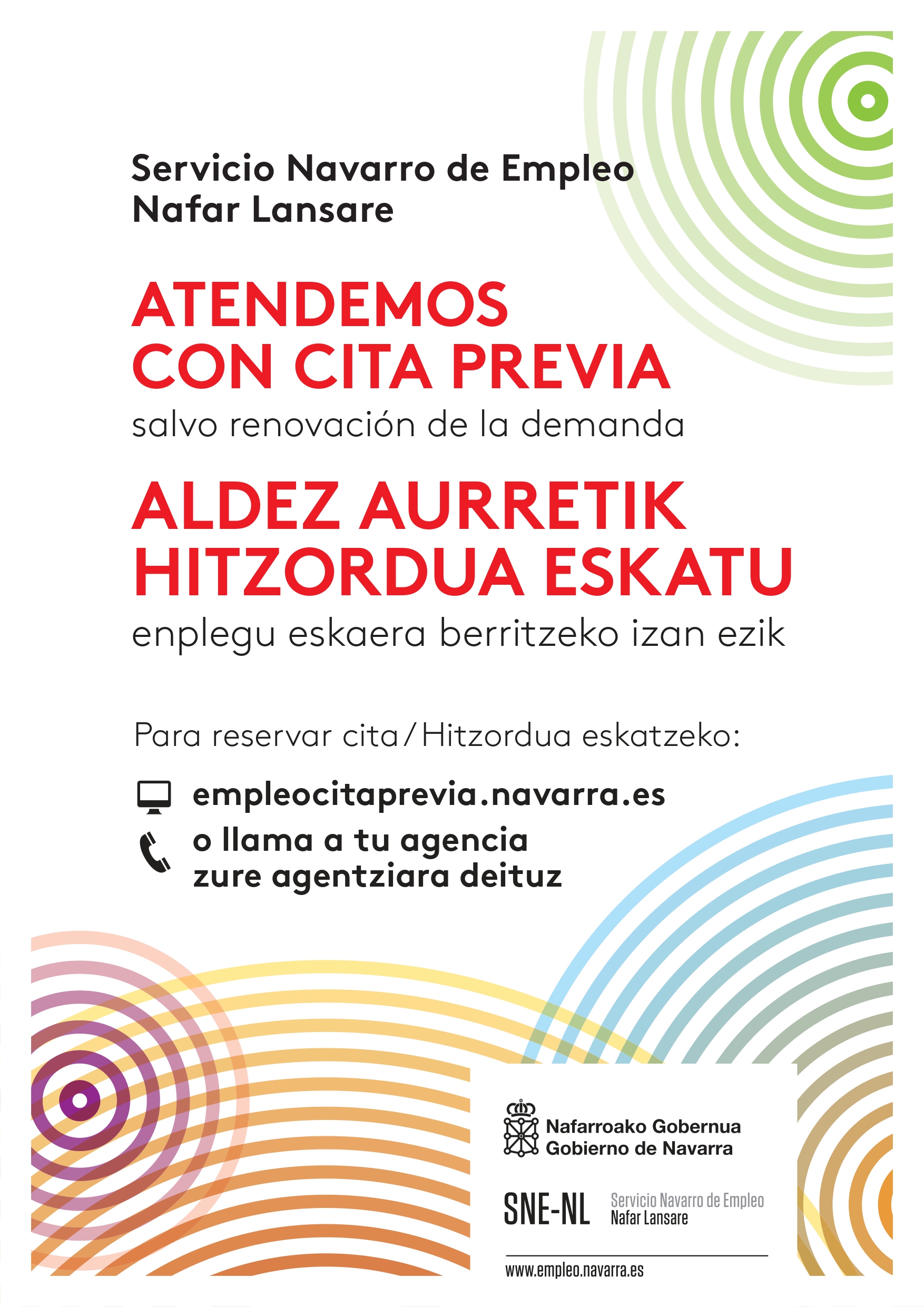 La agencia del Servicio Navarro de Empleo – Nafar Lansare (SNE-NL) en Tudela ha pasado a atender con cita. Las personas interesadas podrán reservar día y hora de atención a través de internet, en empleocitaprevia.navarra.es, o llamando a la oficina teléfono 948 82 18 70.