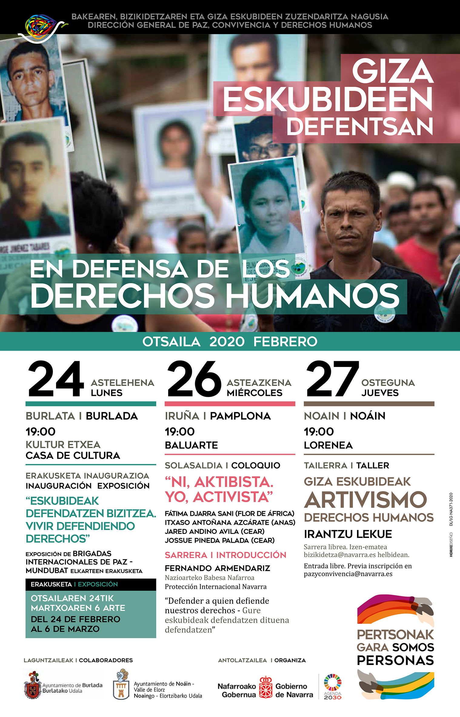 El programa “Somos Personas” comenzará el próximo 24 de febrero, con las jornadas “En defensa de los Derechos Humanos”, que propondrán tres actividades diferentes para poner en valor a personas y colectivos que trabajan por defender los derechos de todas las personas. En la organización de las actividades han colaborado los ayuntamientos de Burlada / Burlata y Noáin / Noain,