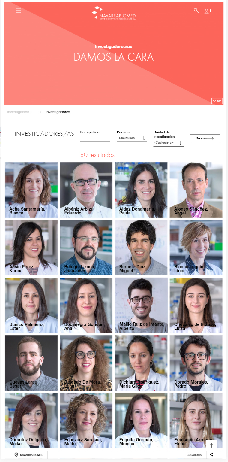 El nuevo desarrollo recoge también la información científica más destacada de Navarrabiomed como las líneas de investigación, proyectos en curso o artículos publicados. Además, ofrece un buscador en el que se puede localizar fácilmente a los y las profesionales de las distintas unidades.