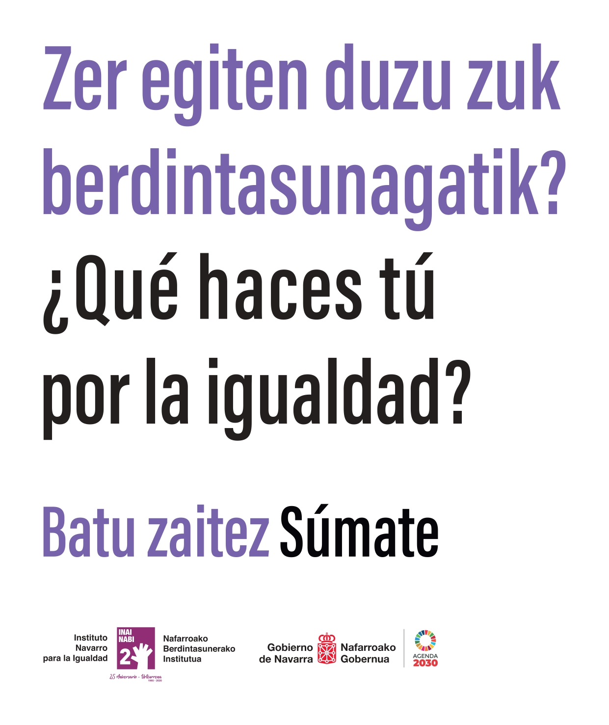 El Gobierno de Navarra, a través del Instituto Navarro para la Igualdad/Nafarroako Berdintasunerako Institutua (INAI/NABI), pone en marcha la campaña con motivo del 8 de marzo, Día Internacional de las Mujeres, con el lema ‘¿Qué haces tú por la igualdad?. La campaña pretende hacer reflexionar a la ciudadanía y anima a la sociedad a adquirir un compromiso personal en la lucha por la consecución de la igualdad real.
