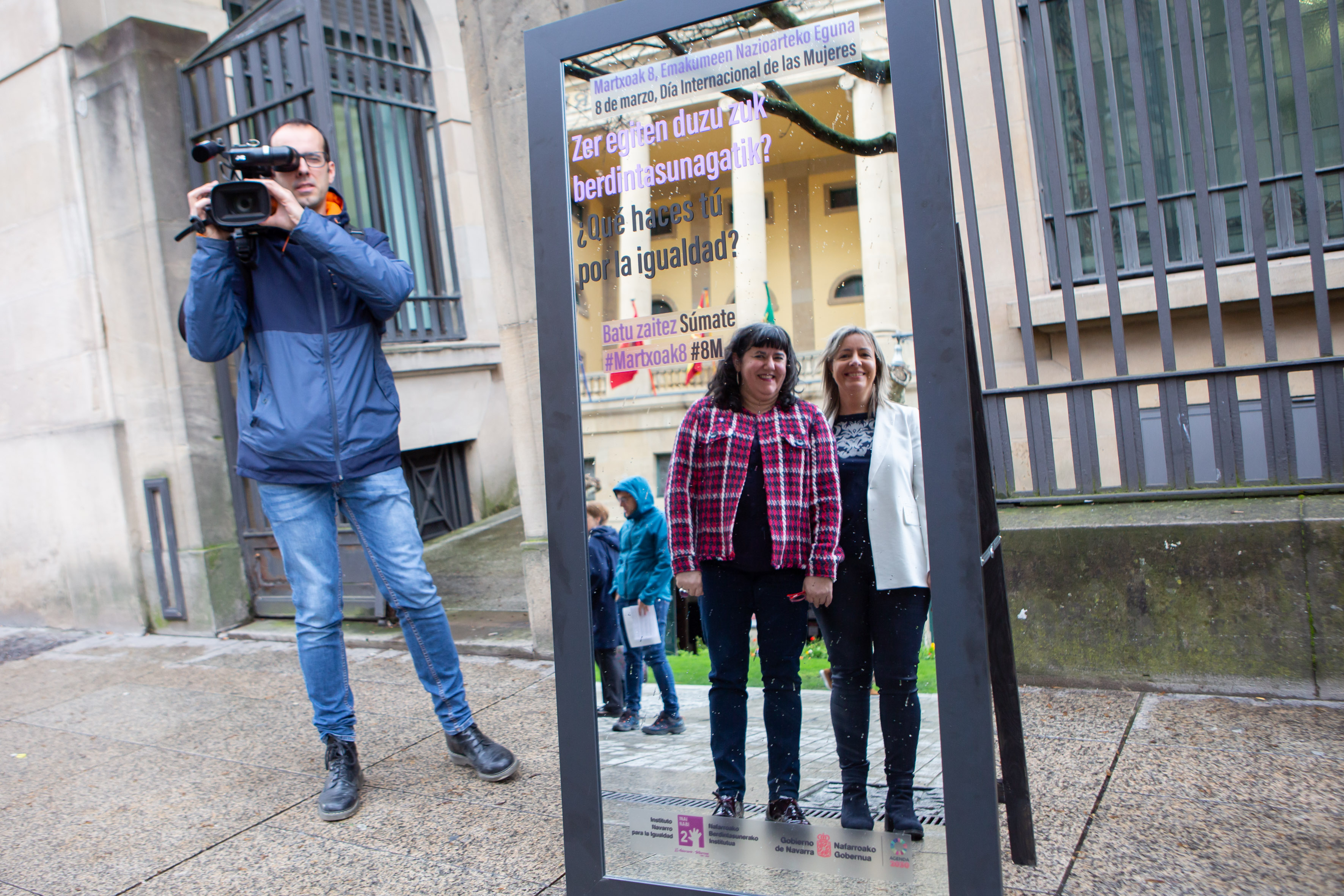 La directora gerente del INAI/NABI, Eva Istúriz, y la subdirectora de Ciudadanía, Empoderamiento y Participación de las Mujeres, María Ángeles García, han presentado esta mañana la campaña con su imagen principal, un espejo. De manera simbólica, el reflejo de cada persona en el espejo -en el que se incluye el lema-, supone un llamamiento a la reflexión sobre lo que cada quien puede hacer a favor de la lucha por la igualdad en su ámbito personal, familiar, laboral, de amistad o de ocio, entre otros.