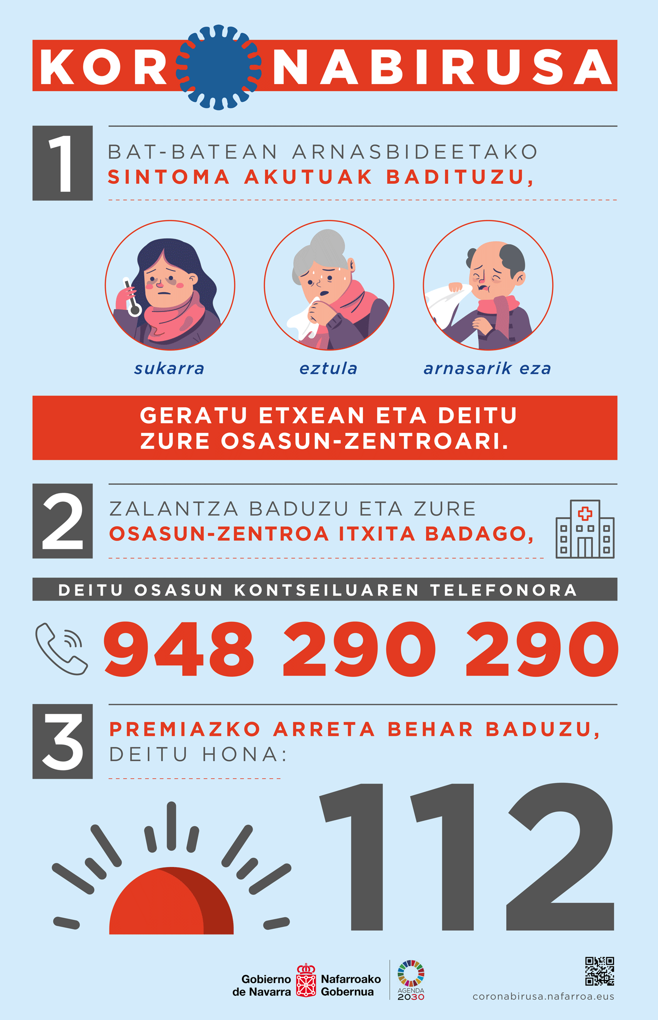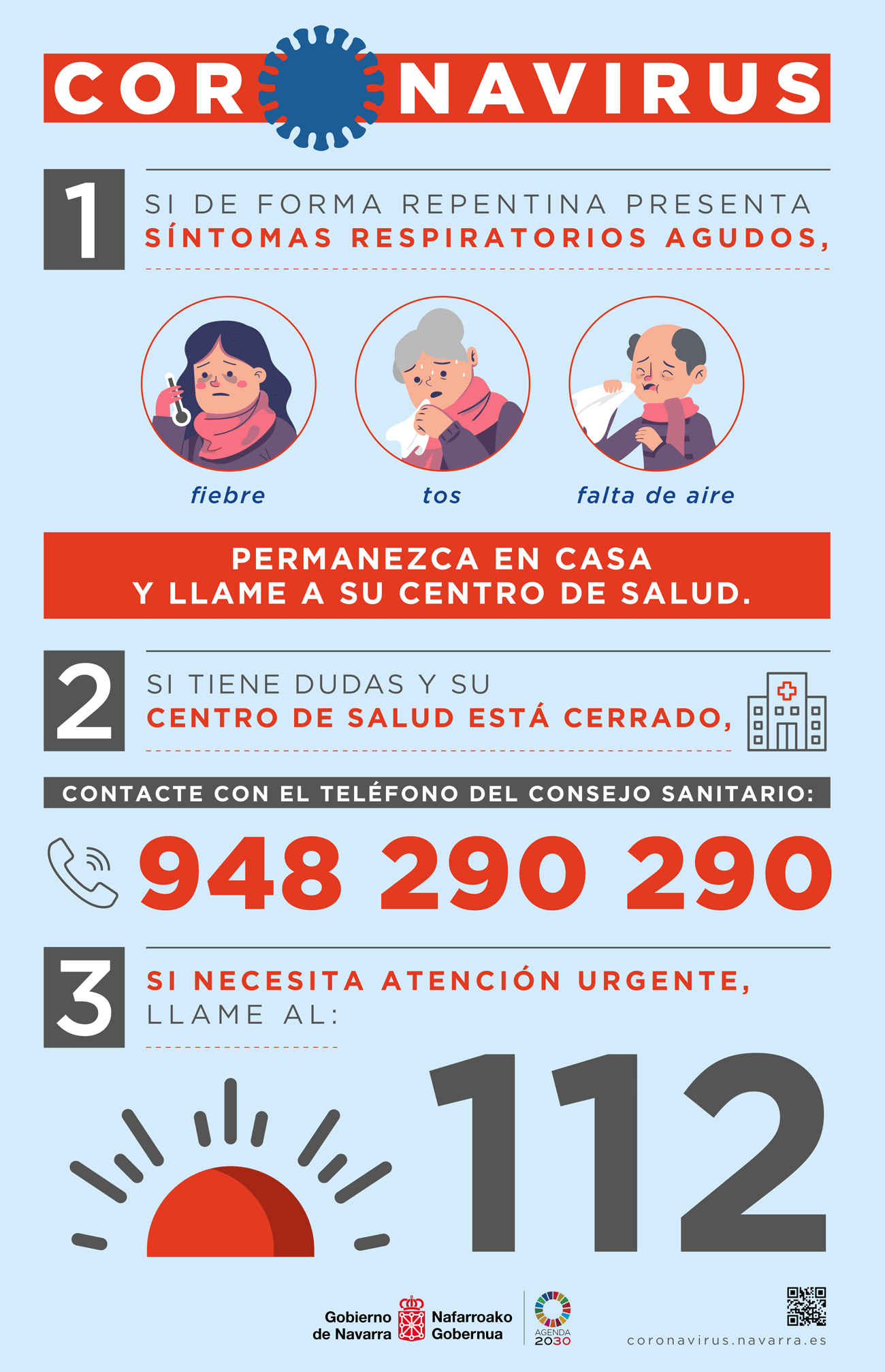 2. Si tiene dudas y su centro de salud está cerrado, contacte con el teléfono de consejo sanitario: 948 290 290.
