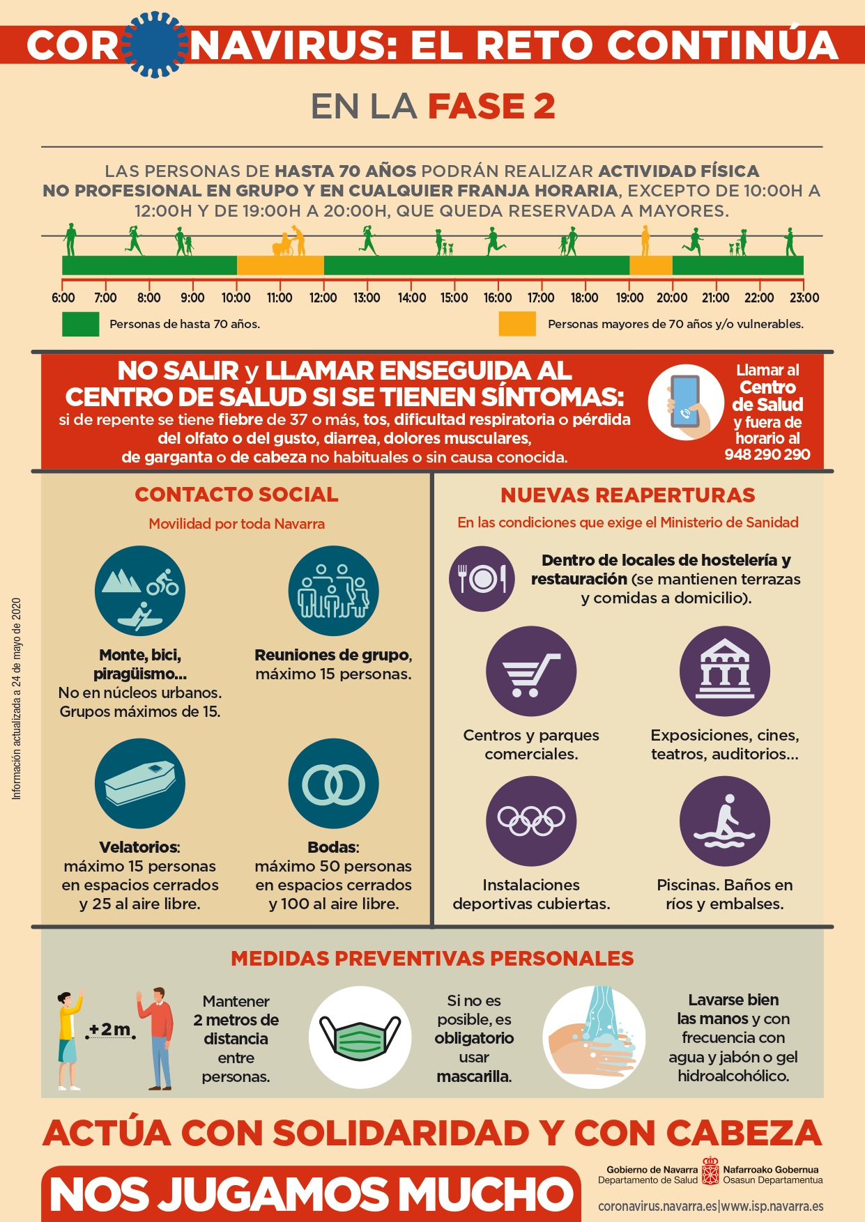 Ante el cambio de fase en el proceso de desescalada, el Departamento de Salud del Gobierno de Navarra ha pedido a la ciudadanía continuar con la responsabilidad que, mayoritariamente, ha venido demostrando hasta ahora. En este sentido, el Instituto de Salud Pública y Laboral de Navarra (ISPLN) ha querido subrayar que en estas fases tempranas de la desescalada se trata “de recuperar poco a poco la vida cotidiana minimizando el riesgo de nuevos contagios y nuevos brotes”, lo que requiere garantizar actividades seguras y una reapertura de centros con un alto grado de cumplimiento del conjunto de medidas preventivas.