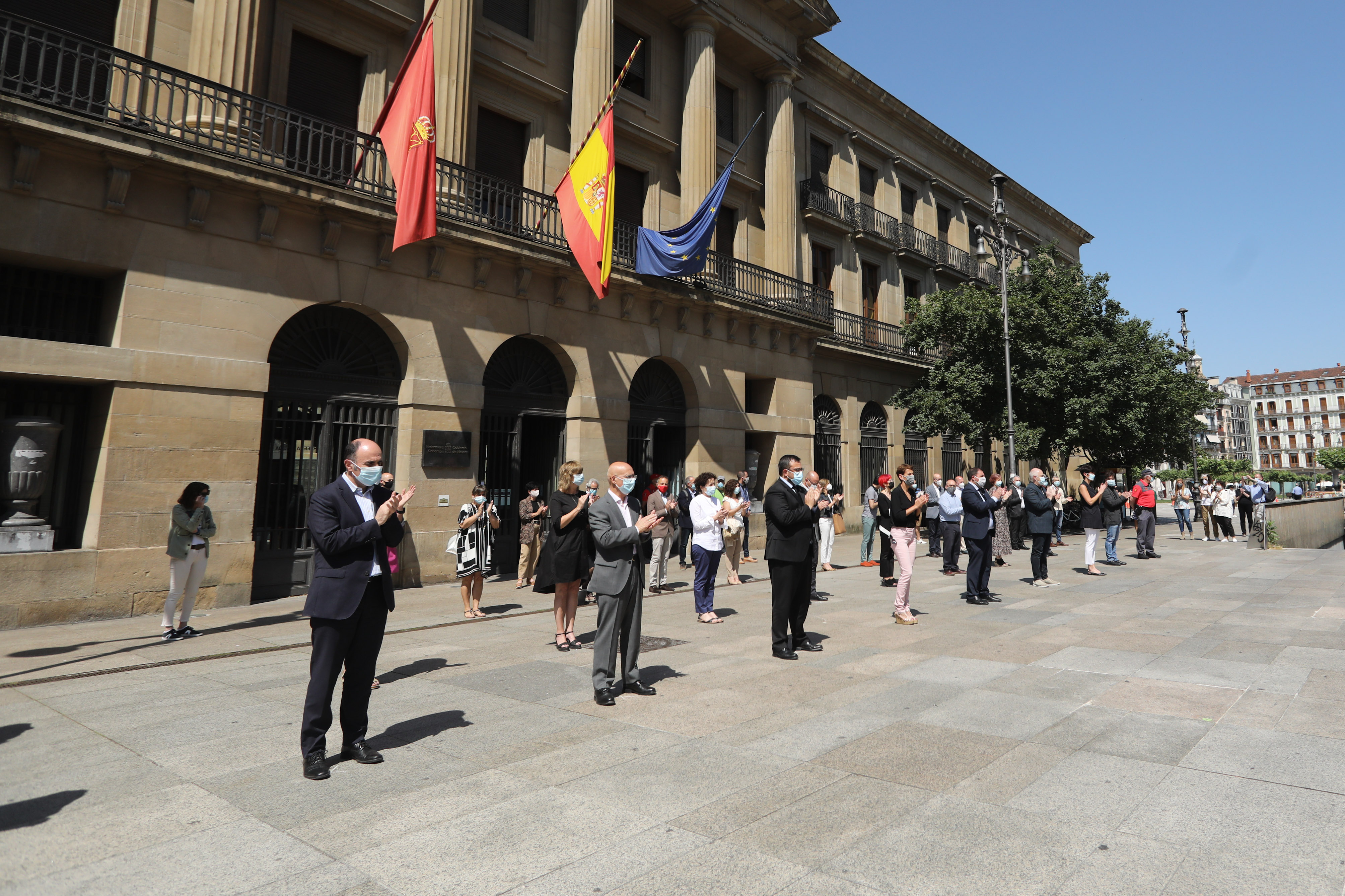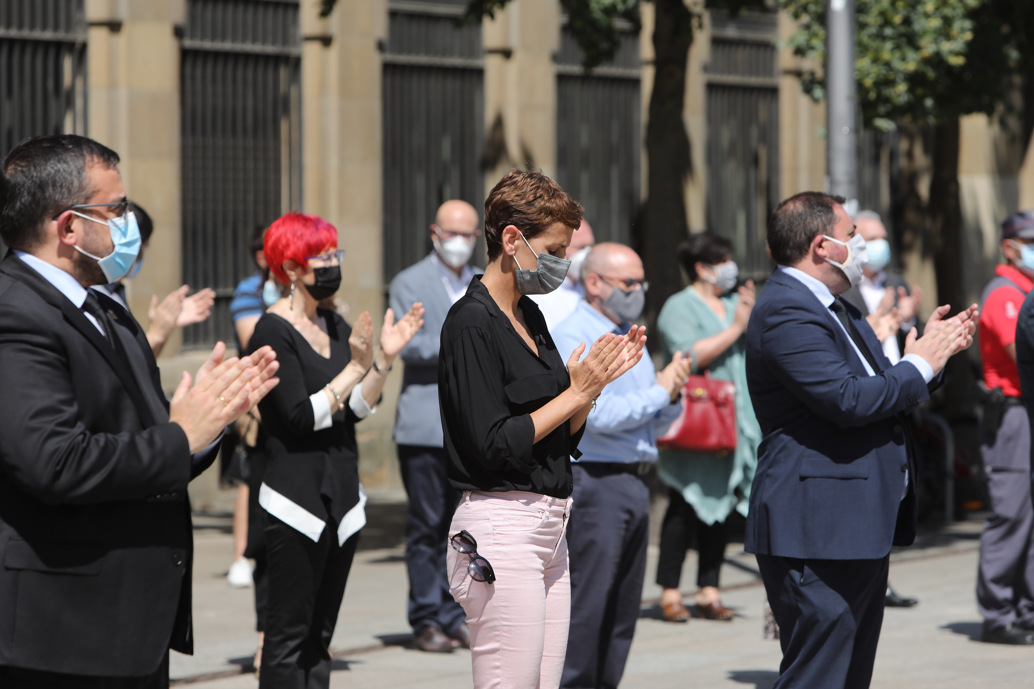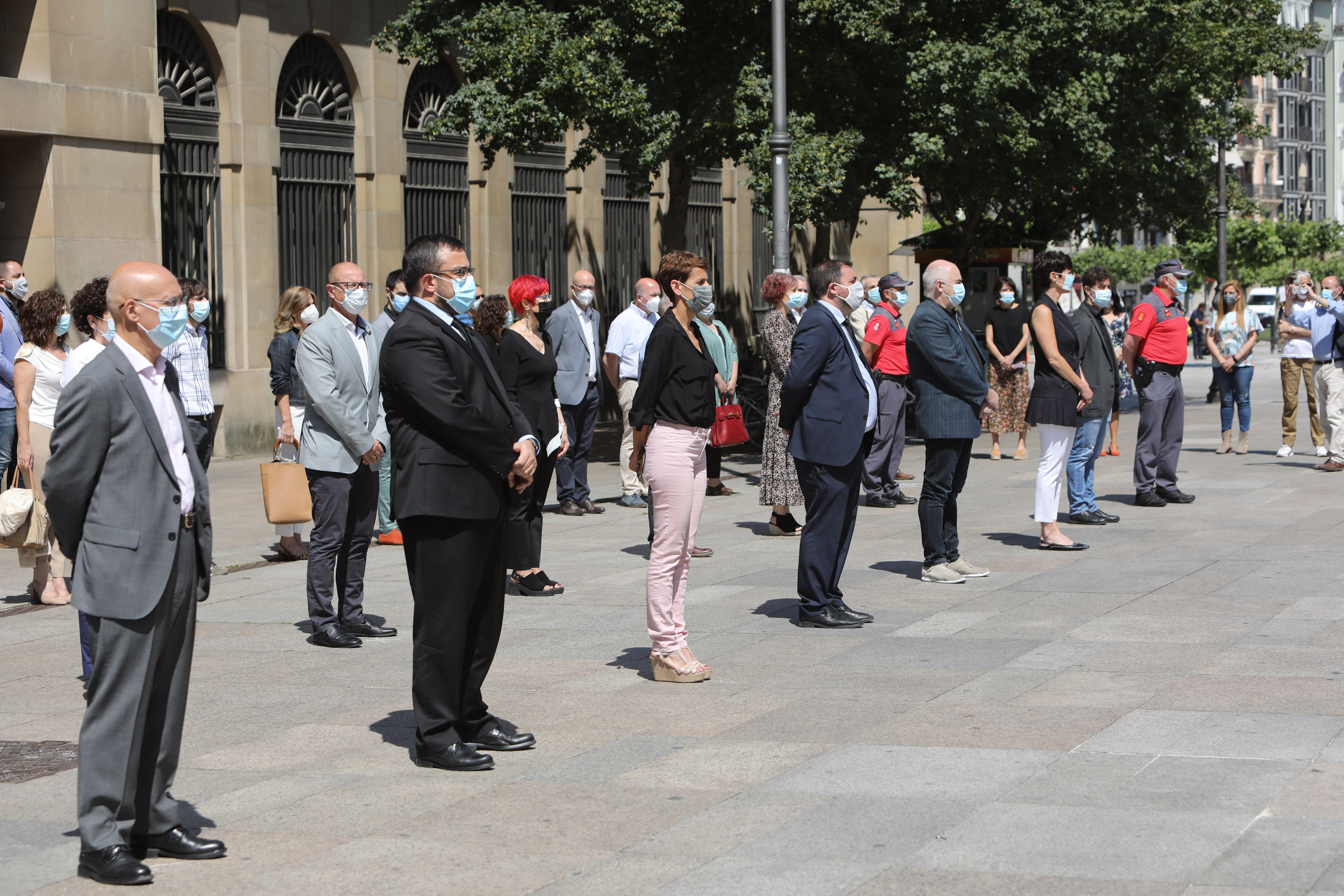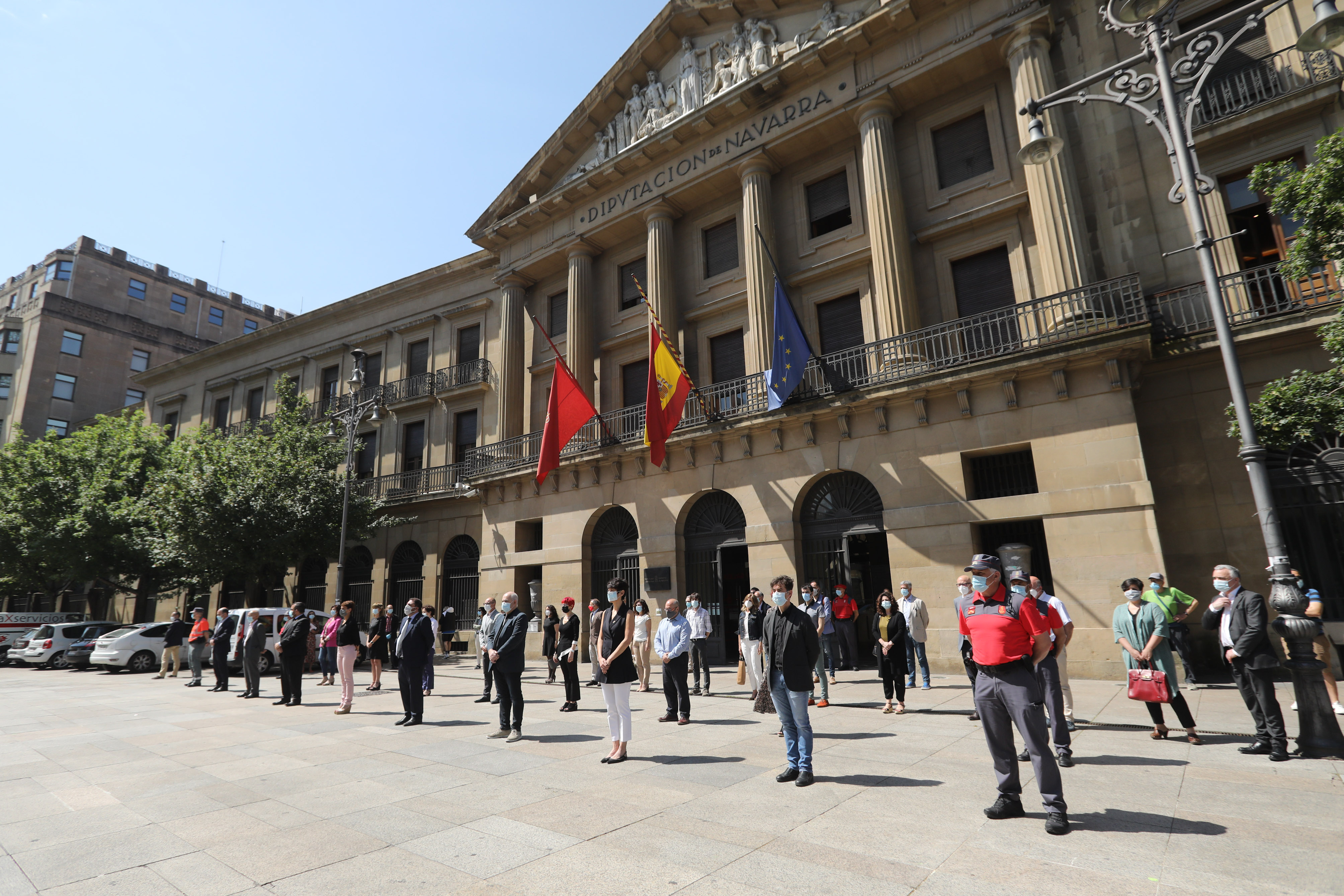El Gobierno de Navarra se ha sumado este miércoles a la convocatoria del Gobierno de España de guardar un minuto de silencio por las víctimas del COVID-19. La  concentración, celebrada a las 12 del mediodía, frente a la entrada del Palacio de Navarra, en la Avenida Carlos III, ha finalizado con aplausos por parte de todas las personas congregadas.