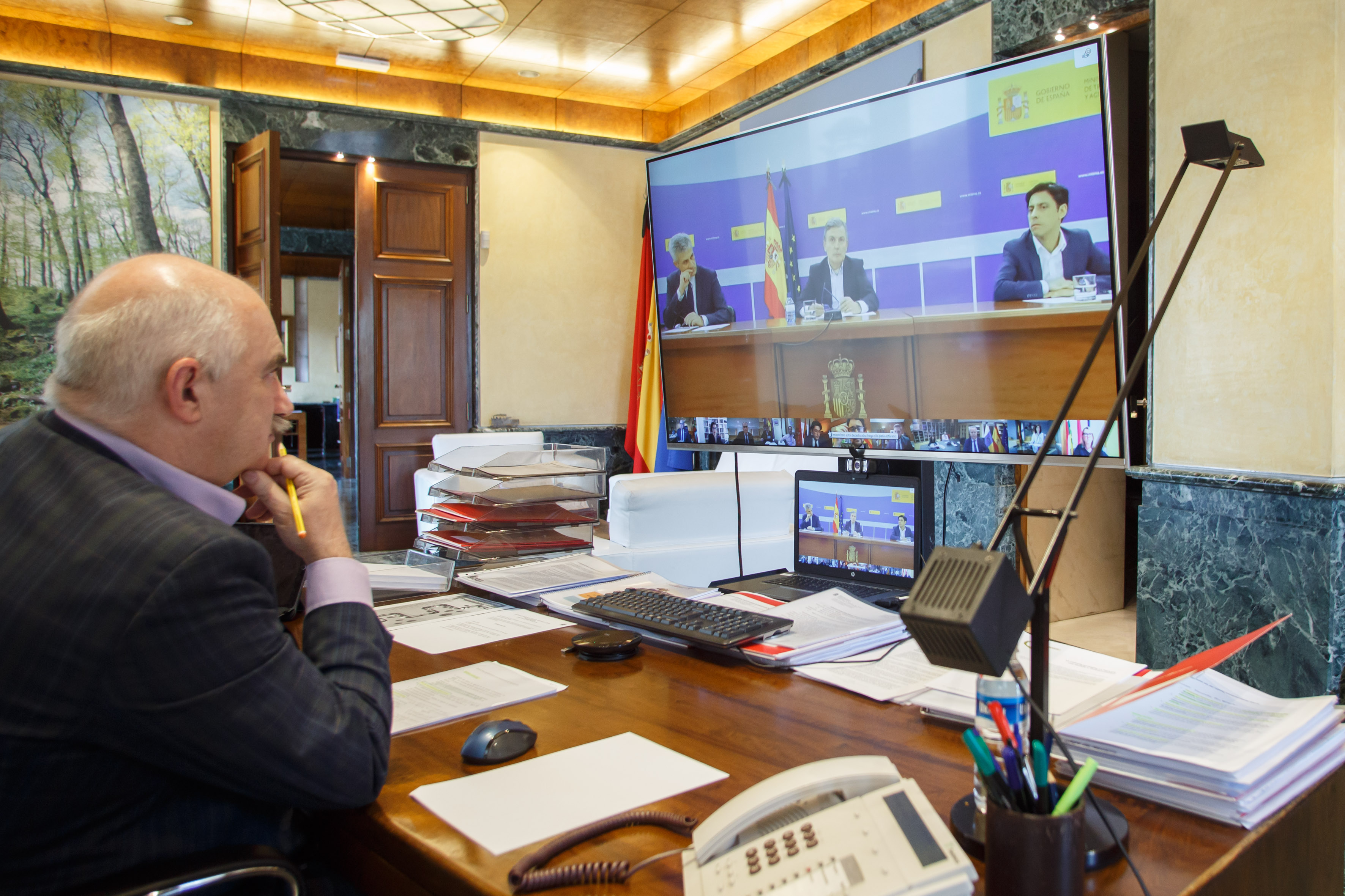 El vicepresidente segundo José Mª Aierdi en el transcurso de la videoconferencia de la Conferencia Sectorial de Vivienda.   Descargar imagen Ver galería de imágenes