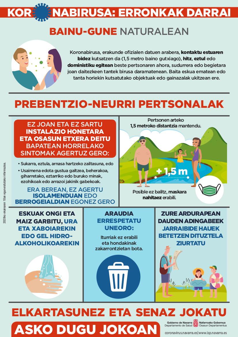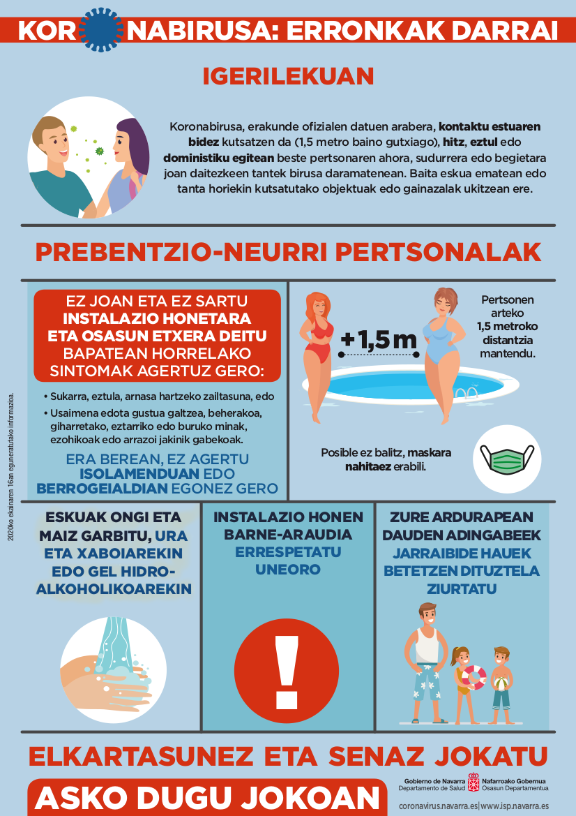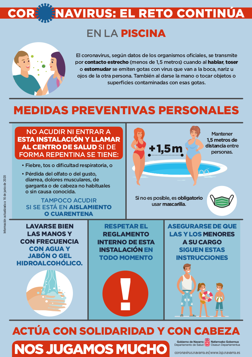 Los aspectos más básicos de las obligaciones y recomendaciones frente al COVID-19 dirigidas a la ciudadanía se han plasmado en dos infografías, una para piscinas y otra en la misma línea para zonas de baño naturales. Un millar de ejemplares, en formato cartel, se van a repartir entre las diversas entidades relacionadas con las instalaciones, como la Federación Navarra de Municipios y Concejos (FNMC), el Colegio de Administradores de Fincas y la asociación AEDONA de Entidades Deportivas y de Ocio de Navarra, que agrupa a los 11 clubes deportivos de Pamplona y su comarca, así como a otras asociaciones del sector.