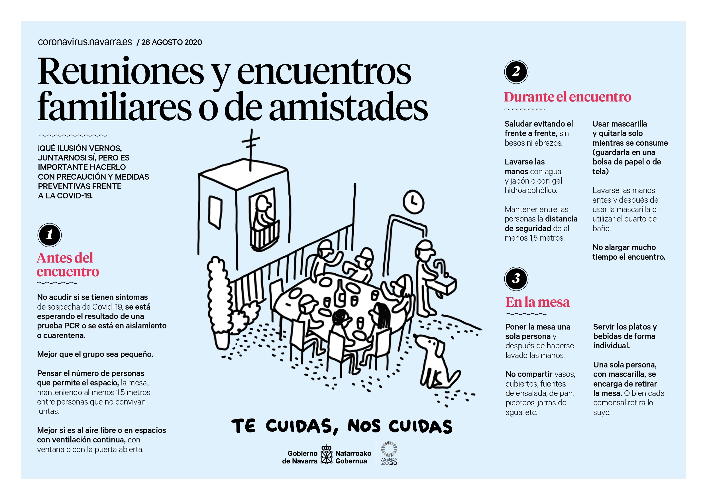 Dado que en Navarra el origen de muchos de los rebrotes de COVID-19 son los encuentros sociales, el Instituto de Salud Pública y Laboral (ISPLN) ha elaborado dos nuevos materiales para informar a la ciudadanía sobre las medidas de prevención básicas al participar en encuentros y reuniones con familiares y amistades, así como en bares y restaurantes, haciendo un llamamiento a toda la sociedad para evitar el incremento de casos acumulados, especialmente a las puertas del inicio del curso escolar.