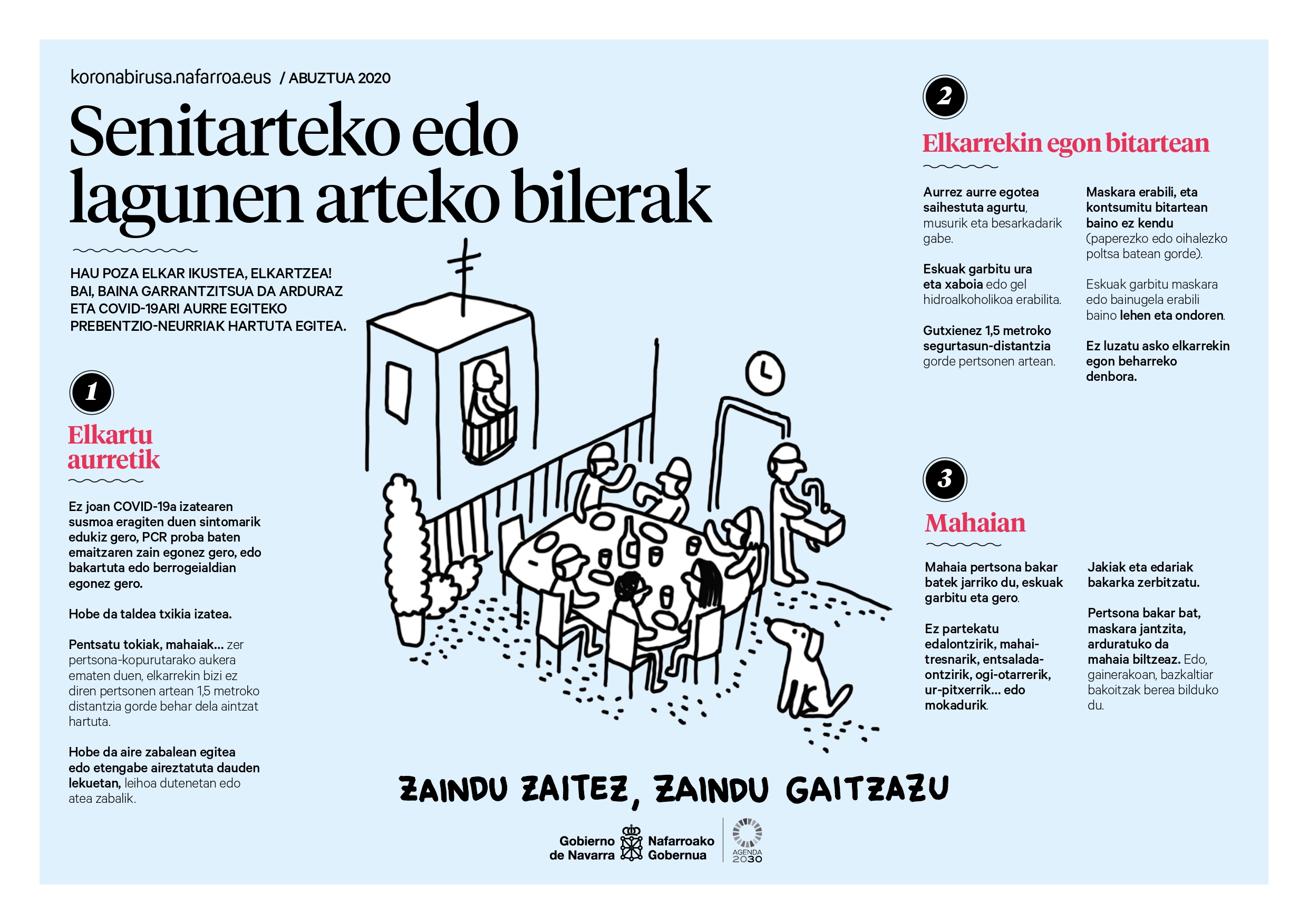 Como refuerzo, para el conocimiento de la ciudadanía, el Instituto de Salud Pública y Laboral de Navarra (ISPLN) ha elaborado dos nuevos materiales con las medidas de prevención básicas en los encuentros familiares y sociales (castellano y euskera), así como en bares y restaurantes (castellano y euskera).