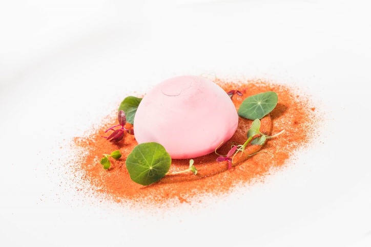 Salmorejo nitro y carabinero, sopa de tomate cremosa y helada con crema de remolacha (preparado con Tomate Feo de Tudela).