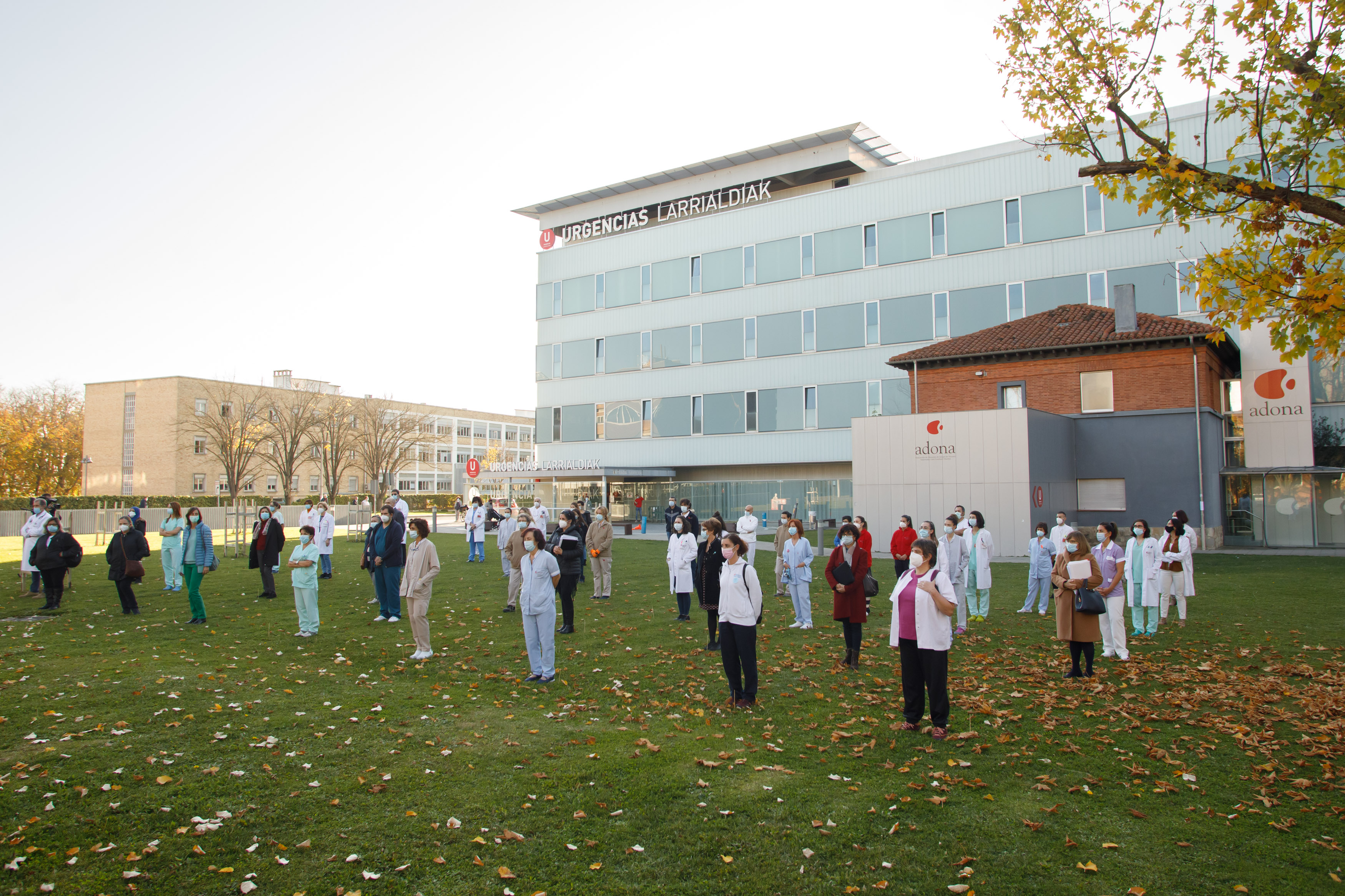 Varias decenas de profesionales, en representación del personal sanitario y sociosanitario galardonado con la Medalla de Oro de Navarra 2020, en los jardines del Complejo Hospitalario.